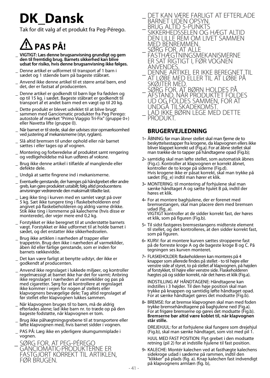 _ Ne pas utiliser lorsque le nombre d’occupants est supérieur aux prescriptions du fabricant. _ Cet article est homologué pour des enfants dans le siège de la naissance jusqu’à un poids de 15 kg. Le marchepied arrière est homologué pour transporter un second enfant dont le poids n’excède pas 20 kg. _ Cet article a été conçu pour être utilisé en combinaison avec les produits Peg Perego Ganciomatic: Siège auto "Primo Viaggio Tri-Fix" (groupe 0+) ou Navetta (groupe 0). _ Prêter attention à la position de l’enfant lors des opérations de réglage des éléments mobiles (poignée, dossier). _ Toujours actionner le frein lorsque l’article est à l’arrêt et pendant l’installation ou la sortie de l’enfant. _ Les opérations d’assemblage, de préparation de l’article, de nettoyage et d’entretien doivent être réalisées uniquement par des adultes. _ Ne pas utiliser cet article si des pièces sont manquantes ou cassées. _ Éviter de mettre les doigts dans les mécanismes. _ Toute charge suspendue aux poignées peut déstabiliser le produit, suivre les recommandations du fabrication sur les charges maximales admises. _ Ne pas utiliser le panier pour transporter des charges dont le poids dépasse 5 kg. Ne pas introduire dans le porte-boisson des charges supérieures à celles indiquées sur le porte-boisson lui-même et ne jamais introduire de boissons chaudes. Ne pas introduire dans les poches de la capote (lorsqu'elles sont présentes) des objets dont le poids dépasse 0.2 kg. _ La main courante n’a pas été conçue pour supporter le poids de l’enfant; elle n’a pas non plus été conçue pour maintenir l’enfant en position assise et ne remplace pas la sangle de sécurité. _ Ne pas utiliser l’article à proximité d’escaliers ou de marches; ne pas l’utiliser à proximité de sources de chaleur, de flammes directes ou d’objets dangereux se trouvant à la portée de l’enfant. _ L’utilisation d’accessoires n’ayant pas été approuvés par le fabricant peut se révéler dangereuse. _ Ne pas utiliser l’habillage pluie (lorsqu’il est présent sur l’article) dans des milieux clos et toujours contrôler que l’enfant n’ait pas trop chaud; ne jamais placer à proximité de sources de chaleur et prendre garde aux cigarettes. S’assurer que l’habillage pluie n’interfère avec aucun mécanisme en mouvement du châssis ou de la poussette; toujours retirer l’habillage pluie avant de refermer le châssis ou la poussette. _ Lorsque la poussette est utilisée avec deux enfants, ne jamais les laisser seuls et ne pas laisser le second enfant monter sur le marchepied arrière tandis que la poussette est vide.