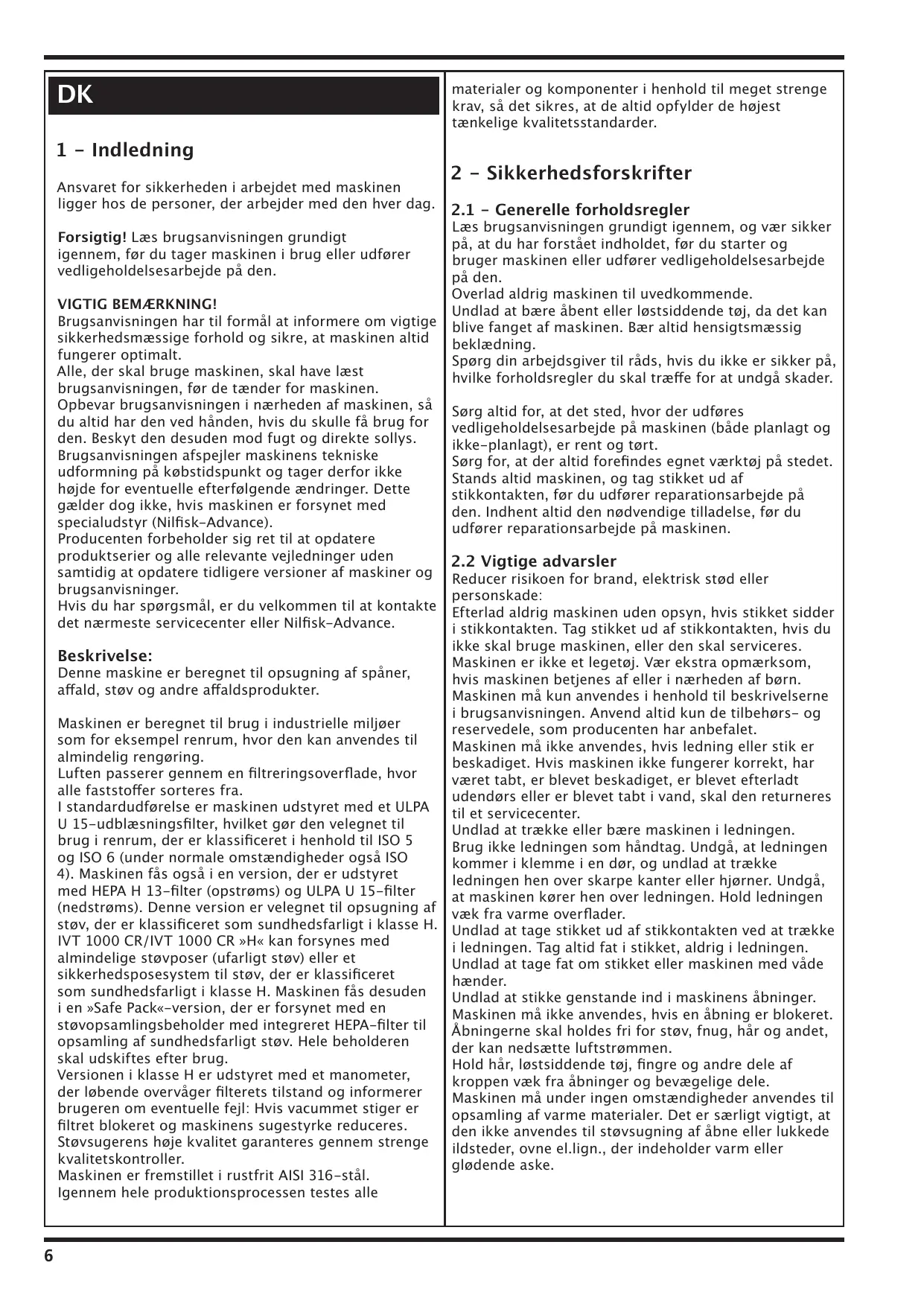 Het filterpatroon en de pakkingen verwijderen en vervangen Schroef de vier schroeven los. Til de roestvrij stalen behuizing met het filterpatroon op. Vervang het filterpatroon en de pakkingen. Plaats de behuizing terug door op de bovenkant ervan te drukken en de vier schroeven terug vast te schroeven. Monteer de handgreep terug en zet vast met de 2 schroeven. De gedemonteerde en vervangen uitblaasfilter moet worden opgeborgen in een plastic tas en moet op de gepaste manier worden weggeruimd. Wees bijzonder voorzichtig bij het vervangen van de hoofdfilter en uitblaasfilter, en draag in ieder geval een masker type P3. Opmerking De uitblaasfilter wordt beschouwd als giftig afval en moet ook als dusdanig worden behandeld. Le présent manuel a été rédigé afin dʼinformer les utilisateurs de la machine sur les précautions et les réglementations relatives à leur sécurité, et de maintenir lʼaspirateur en bon état de fonctionnement. Le personnel autorisé à travailler avec la machine doit comprendre le manuel avant de la mettre en marche. Garder le manuel à proximité de la machine, à un emplacement sec et protégé, non exposé à la lumière directe du soleil et immédiatement disponible pour être consulté au besoin. Le présent manuel reflète lʼétat le plus récent de la technologie au moment de la vente et ne peut pas être considéré comme approprié en cas de modifications ultérieures, sauf si un kit Nilfisk- Advance a été installé sur la machine. Le fabricant se réserve le droit de mettre à jour sa gamme de production et les manuels qui sʼy rapportent sans être tenu de mettre à jour les machines et manuels précédemment fournis. Consulter le centre de service après-vente le plus proche ou Nilfisk-Advance en cas de doute. Description : Cette machine a été conçue pour ramasser les copeaux, les débris, la poussière et autres déchets. Lʼaspirateur a été conçu et construit pour fonctionner en environnement industriel tel quʼune salle blanche où il peut servir au nettoyage normal. De lʼair passe à travers une surface filtrante où les solides en suspension sont retenus. En version standard, la machine est équipée de filtres de refoulement ULPA U 15 qui rendent la machine apte à une utilisation en salles blanches ISO 5 ET ISO 6 (en conditions normales, même ISO classe 4). Une version de classe « H » équipée dʼun filtre amont HEPA H 13 et dʼun filtre aval ULPA U 15 est également disponible. En classe « H », cette machine convient aussi contre les poussières présentant un risque pour la santé. Les modèles IVT 1000 CR / IVT 1000 CR «H» peuvent être équipé dʼun sac à poussière standard (poussière non dangereuse) ou dʼun « sac de sécurité » convenant à la poussière dangereuse en classe « H ». Une version « Safe Pack » de la machine est également disponible - celle-ci comporte un bac de ramassage de la poussière avec filtre HEPA intégré, utilisable pour la poussière dangereuse. Le bac complet est remplacé après usage. La jauge de pression installée sur la machine (classe « H » uniquement) prévient lʼopérateur de lʼétat du filtre : une augmentation de pression représente une réduction de la puissance dʼaspiration de la machine La qualité élevée de lʼaspirateur est garantie par les tests les plus sévères.
