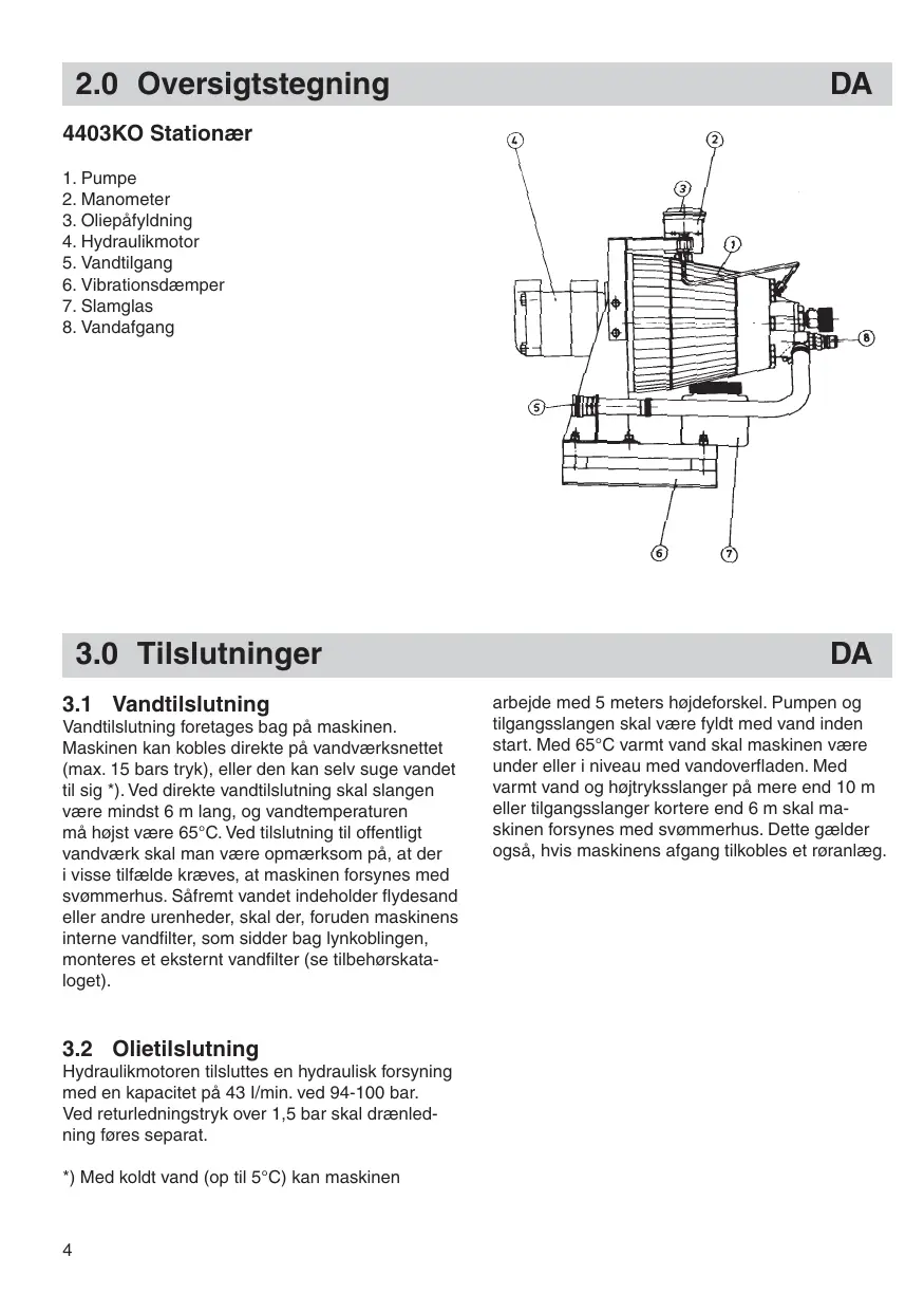 *) With cold water (up to 5°C) the cleaner will operate satisfactorily with up to a 5 metre difference of level between cleaner and water supply. The pump and the inlet hose must be connected to the water supply before starting up. When working with hot water (65°C) the cleaner must be below or on a level with the point of water supply. Working with hot water and connected to high pressure hoses longer than 10 m or inlet hoses shorter than 6 m, the cleaner must be equipped with a float chamber. The same applies if the outlet of the cleaner is connected to a tube system.