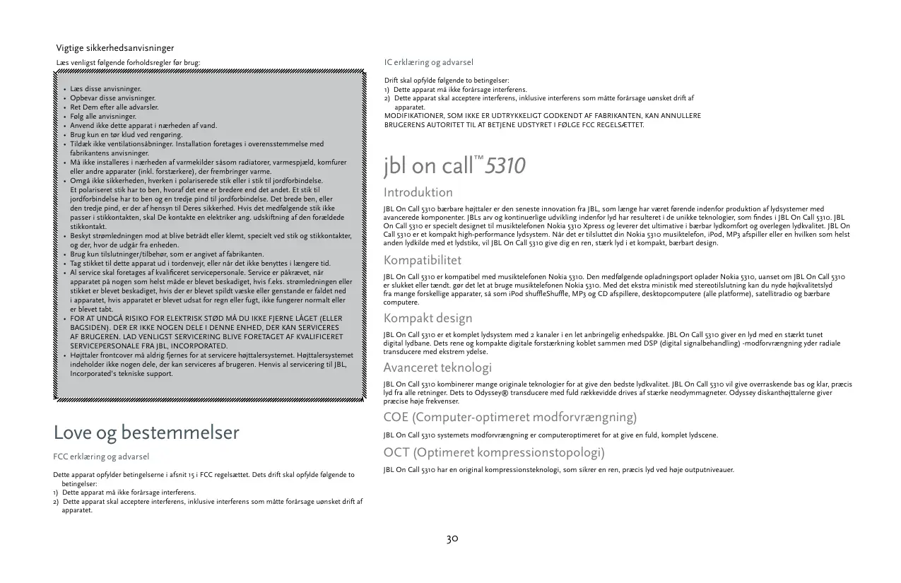 apparatet. MODIFIKATIONER, SOM IKKE ER UDTRYKKELIGT GODKENDT AF FABRIKANTEN, KAN ANNULLERE BRUGERENS AUTORITET TIL AT BETJENE UDSTYRET I FØLGE FCC REGELSÆTTET. jbl on call™5310 Introduktion JBL On Call 5310 bærbare højttaler er den seneste innovation fra JBL, som længe har været førende indenfor produktion af lydsystemer med avancerede komponenter. JBLs arv og kontinuerlige udvikling indenfor lyd har resulteret i de unikke teknologier, som findes i JBL On Call 5310. JBL On Call 5310 er specielt designet til musiktelefonen Nokia 5310 Xpress og leverer det ultimative i bærbar lydkomfort og overlegen lydkvalitet. JBL On Call 5310 er et kompakt high-performance lydsystem. Når det er tilsluttet din Nokia 5310 musiktelefon, iPod, MP3 afspiller eller en hvilken som helst anden lydkilde med et lydstikx, vil JBL On Call 5310 give dig en ren, stærk lyd i et kompakt, bærbart design. Kompatibilitet JBL On Call 5310 er kompatibel med musiktelefonen Nokia 5310. Den medfølgende opladningsport oplader Nokia 5310, uanset om JBL On Call 5310 er slukket eller tændt. gør det let at bruge musiktelefonen Nokia 5310. Med det ekstra ministik med stereotilslutning kan du nyde højkvalitetslyd fra mange forskellige apparater, så som iPod shuffleShuffle, MP3 og CD afspillere, desktopcomputere (alle platforme), satellitradio og bærbare computere. Kompakt design JBL On Call 5310 er et komplet lydsystem med 2 kanaler i en let anbringelig enhedspakke. JBL On Call 5310 giver en lyd med en stærkt tunet digital lydbane. Dets rene og kompakte digitale forstærkning koblet sammen med DSP (digital signalbehandling) -modforvrængning yder radiale transducere med ekstrem ydelse. Avanceret teknologi JBL On Call 5310 kombinerer mange originale teknologier for at give den bedste lydkvalitet. JBL On Call 5310 vil give overraskende bas og klar, præcis lyd fra alle retninger. Dets to Odyssey® transducere med fuld rækkevidde drives af stærke neodymmagneter. Odyssey diskanthøjttalerne giver præcise høje frekvenser. Love og bestemmelser FCC erklæring og advarsel Dette apparat opfylder betingelserne i afsnit 15 i FCC regelsættet. Dets drift skal opfylde følgende to betingelser: