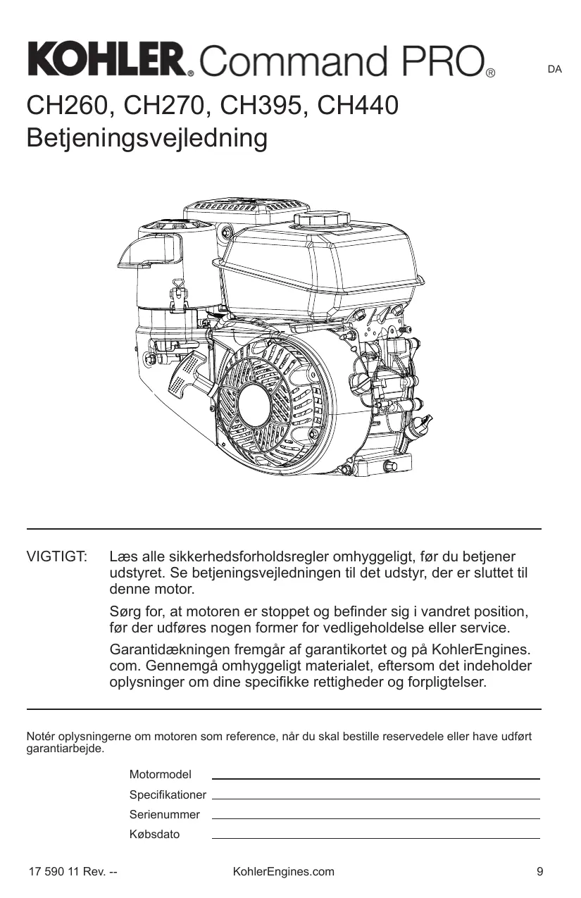 CH260, CH270, CH395, CH440 Betjeningsvejledning VIGTIGT: Læs alle sikkerhedsforholdsregler omhyggeligt, før du betjener udstyret. Se betjeningsvejledningen til det udstyr, der er sluttet til denne motor. Sørg for, at motoren er stoppet og befinder sig i vandret position, før der udføres nogen former for vedligeholdelse eller service. Garantidækningen fremgår af garantikortet og på KohlerEngines. com. Gennemgå omhyggeligt materialet, eftersom det indeholder oplysninger om dine specifikke rettigheder og forpligtelser. Notér oplysningerne om motoren som reference, når du skal bestille reservedele eller have udført garantiarbejde. Motormodel Specifikationer Serienummer Købsdato 17 590 11 Rev. -- KohlerEngines.com
