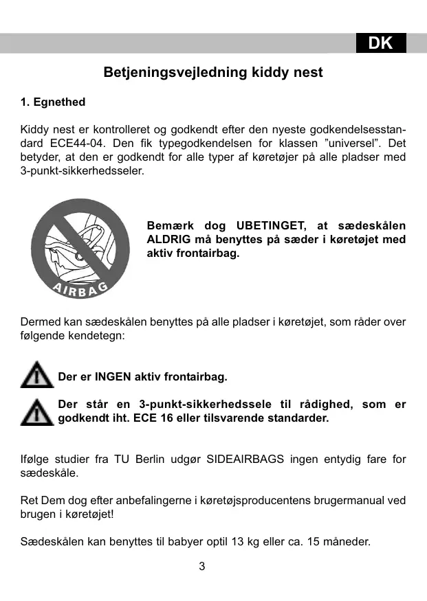Kiddy nest er kontrolleret og godkendt efter den nyeste godkendelsesstandard ECE44-04. Den fik typegodkendelsen for klassen ”universel”. Det betyder, at den er godkendt for alle typer af køretøjer på alle pladser med 3-punkt-sikkerhedsseler. Bemærk dog UBETINGET, at sædeskålen ALDRIG må benyttes på sæder i køretøjet med aktiv frontairbag. Dermed kan sædeskålen benyttes på alle pladser i køretøjet, som råder over følgende kendetegn: Der er INGEN aktiv frontairbag. Der står en 3-punkt-sikkerhedssele til rådighed, som er godkendt iht. ECE 16 eller tilsvarende standarder. Ifølge studier fra TU Berlin udgør SIDEAIRBAGS ingen entydig fare for sædeskåle. Ret Dem dog efter anbefalingerne i køretøjsproducentens brugermanual ved brugen i køretøjet! Sædeskålen kan benyttes til babyer optil 13 kg eller ca. 15 måneder.