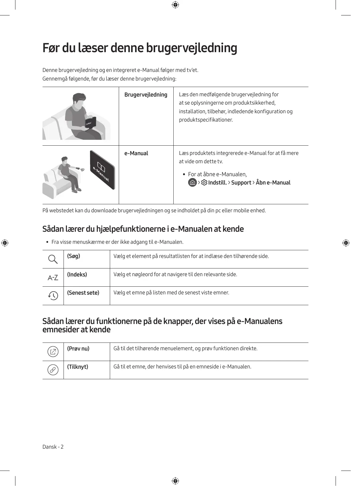 - • For at åbne e-Manualen, > Indstill. > Support > Åbn e-Manual På webstedet kan du downloade brugervejledningen og se indholdet på din pc eller mobile enhed. Sådan lærer du hjælpefunktionerne i e-Manualen at kende