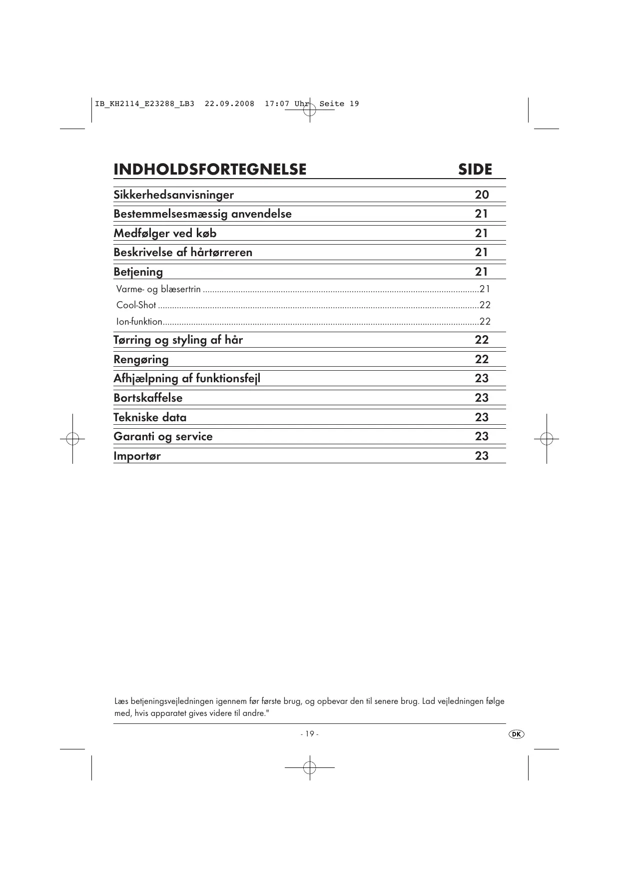 INDHOLDSFORTEGNELSE SIDE Sikkerhedsanvisninger 20 Bestemmelsesmæssig anvendelse 21 Medfslger ved kgb 21 Beskrivelse af härtarreren 21 Betjening Varme- og blæsertrin … Cool-Shot lon-funktion… Torring og styling af här 22 Rengpring 22 Afhjiælpning af funktionsfeil 23 Bortskaffelse 23 Tekniske data 23 Garanti og service 23 Importar 23 Læs befjeningsveiledningen igennem far farste brug, og opbevar den til senere brug. Lad veiledningen folge med, hvis apparatet gives videre til andre."