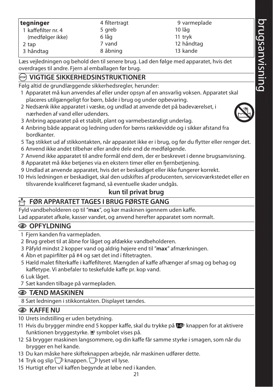 tegninger 4 filtertragt 9 varmeplade © 1 kaffefilter nr. 4 5 greb 10 läg (medfolger ikke) 6 läg T1 tryk 2tap 7 vand 12 händtag 3 händtag 8 äbning 13 kande