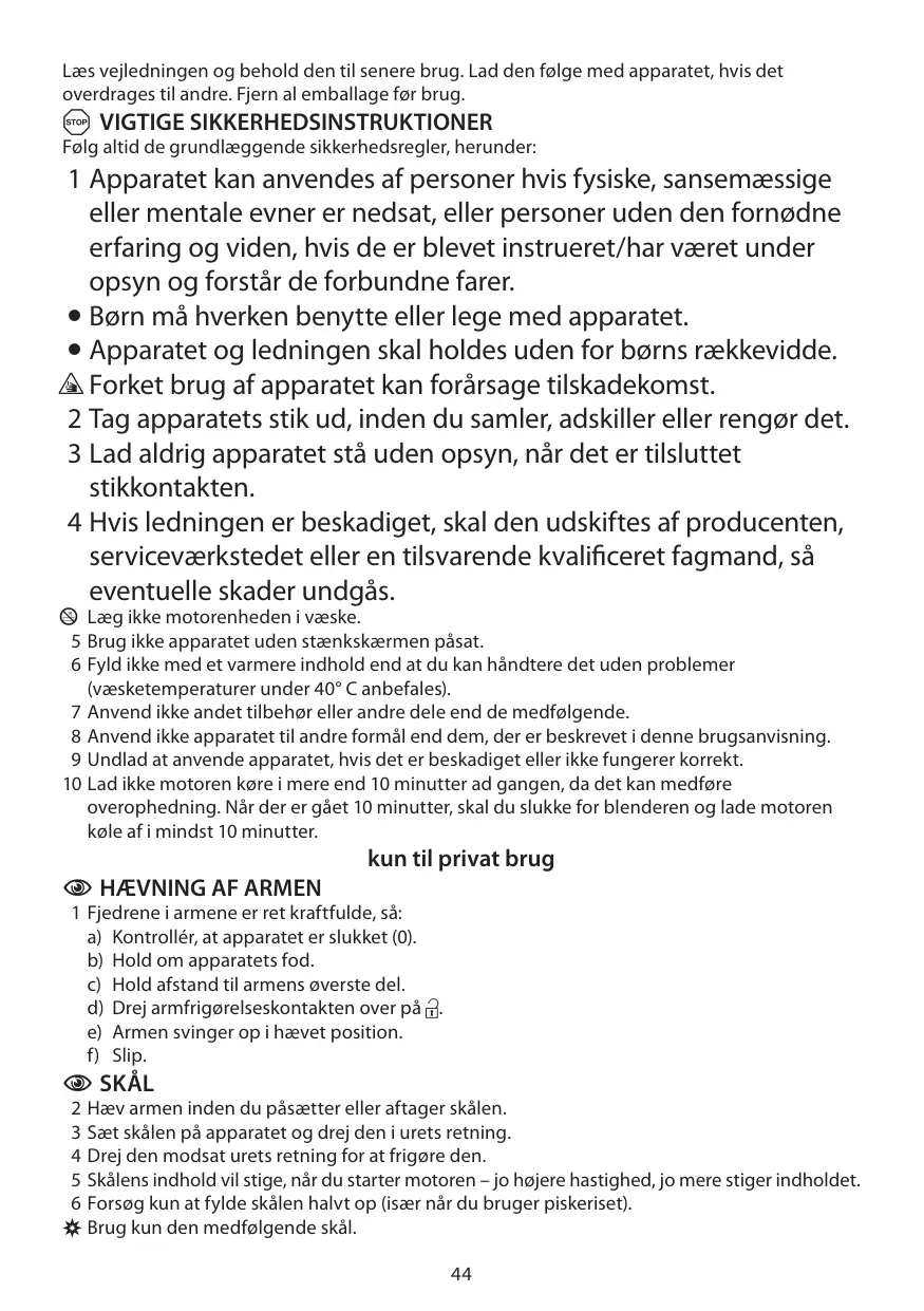 kun til privat brug © HÆVNING AF ARMEN 1 Fjedrene i armene er ret kraftfulde, sä: a) Kontrollér, at apparatet er slukket (0). b) Hold om apparatets fod. © Hold afstand til armens overste del. d) Drej armfrigarelseskontakten over pà a. €) Armen svinger op i hævet position. f Slip. © SKÂL 2 Hæv armen inden du pâsætter eller aftager skälen. 3 Sæt skälen pà apparatet og drej den i urets retning. 4 Drej den modsat urets retning for at frigare den. 5 Skälens indhold vil stige, när du starter motoren - jo hajere hastighed, jo mere stiger indholdet. 6 Forsag kun at fylde skälen halvt op (især när du bruger piskeriset). 3% Brug kun den medfolgende skäl.