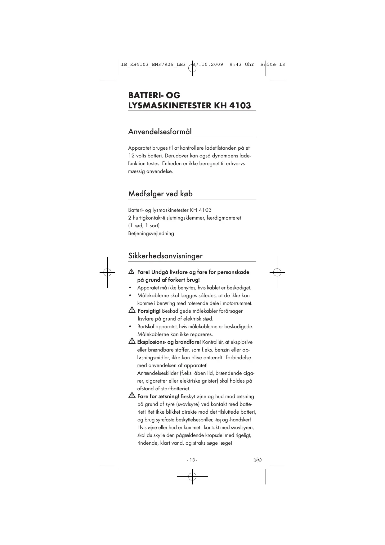 BATTERI- OG LYSMASKINETESTER KH 4103 Anvendelsesformäl Apparatet bruges til at kontrollere ladetilstanden pà et 12 volts batteri. Derudover kan ogsä dynamoens lade- funktion testes. Enheden er ikke beregnet til erhvervs- maæssig anvendelse. Medfolger ved kob Batteri- og lysmaskinetester KH 4103 2 hurtigkontakttilslutningsklemmer, færdigmonteret (1 red, 1 sort) Befjeningsveiledning Sikkerhedsanvisninger À Fare! Undgä livsfare og fare for personskade pà grund af forkert brugl + Apparatet mà ikke benyites, hvis kablet er beskadiget. + Mälekablerne skal lægges säledes, at de ikke kan komme i beraring med roterende dele i motorrummet. À Forsigtigl Beskadigede mälekabler forärsager lisviare pà grund af elektrisk stad + Boriskaf apparatet, hvis mälekablere er beskadigede. Mälekablerne kan ikke repareres. Eksplosions- og brandfarel Kontrollér, at eksplosive eller brændbare stoffer, som f.eks. benzin eller op- lasningsmidler, ikke kan blive antændt i forbindelse med anvendelsen af apparatetl Antændelseskilder [f.eks. äben ild, brændende ciga- rer, cigaretter eller elektriske gnister) skal holdes pà afstand af startbatteriet. À Fare for ætsningl Beskyt ajne og hud mod ætsning pä grund af syre (svovisyre] ved kontakt med batte- riet! Ret ikke blikket direkte mod det tilsluttede batteri, og brug syrefaste beskyttelsesbriller, tai og -handskerl Hvis ajne eller hud er kommet i kontakt med svovisyren, skal du skylle den pägældende kropsdel med rigeligi, rindende, klart vand, og straks sage lægel sdite 13