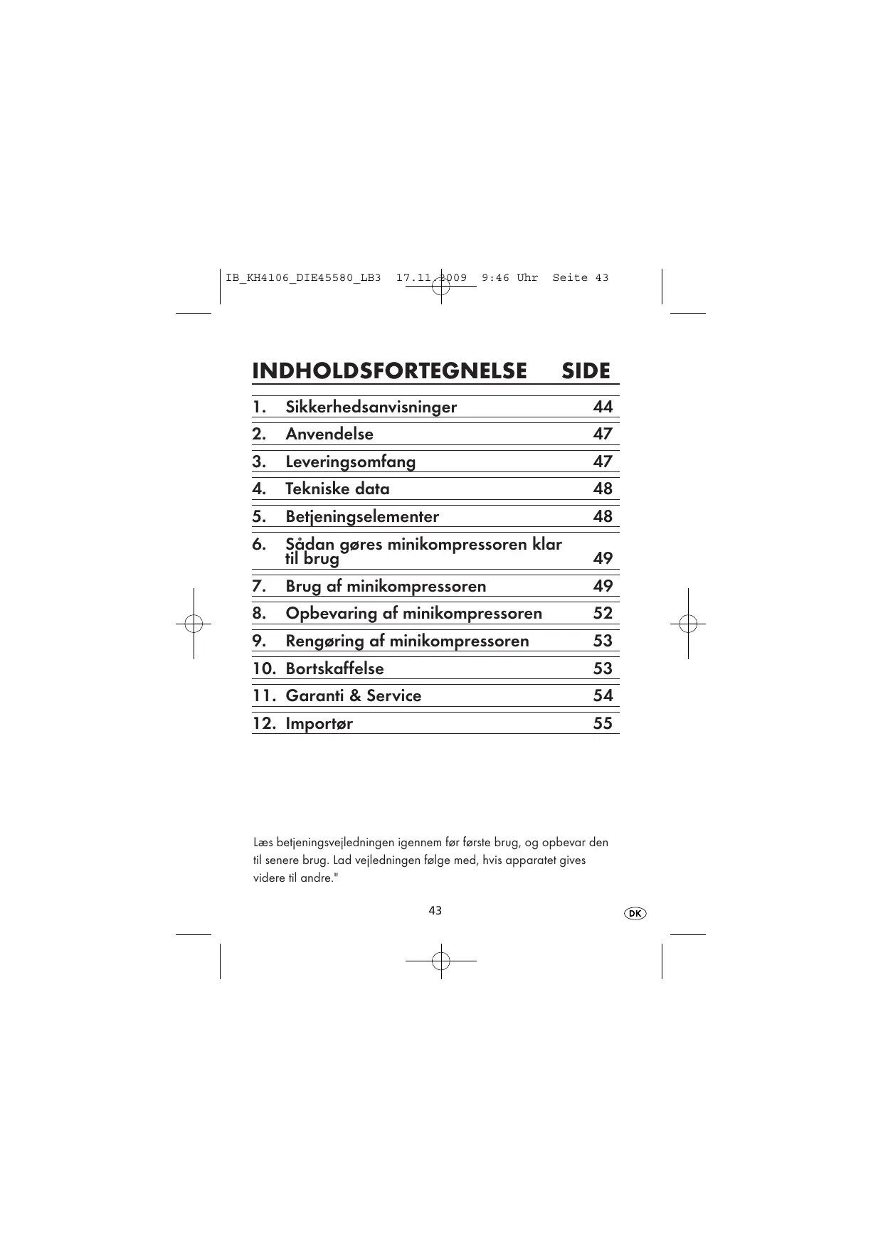 IB_KH4106 DIE45580 LB3 17 sp 9:46 Uhr Seite 45 Derfor: Stil ikke minikompressoren lige i nærheden af varmekilder. Stil ikke ébne varmekilder - F.eks. brændende lys - pà minikom- pressoren! Efterlad ikke minikompressoren i bilen, hvis temperature udenfor er hoj, Især om sommeren kan bilen blive meget varm indeni. Tildæk aldrig minikompressorens ventilationsäbninger! Stil ikke mini- kompressoren pä tæpper eller andre teks-tilmaterialer etc. Bemærk, at minikompressoren ikke er egnet til vedvarende brug. Lad derfor ikke minikompressoren være tændi uafbrudi i mere end 10 minutter. Lad den afkgle mindst 30 minutter, far den tændes igen. Brug og opbevar ikke minikompressoren i stavede omgivelser. Der kan trænge stev ind i minikompressoren. Hvis der trænger starre maængder stav ind i minikompressoren, kan det fare til overophed ning og skader, som ikke kan repareres. Der er fare for brandl Forsag aldrig selv at reparere stramkablet, hvis det er defekt! Der er fare for elektrisk st&d! Henvend dig i stedet til en af vores servicepartnere.