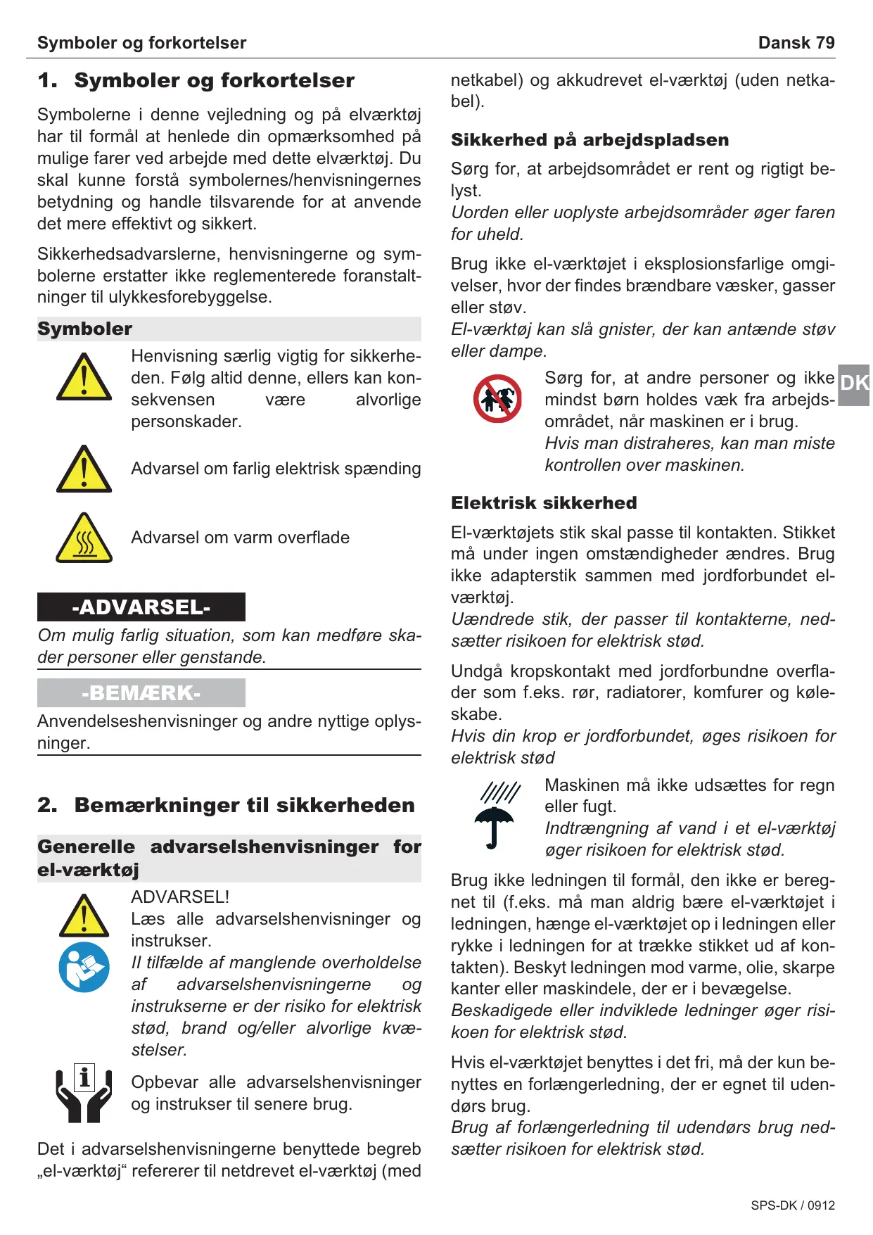 Symbolerne i denne vejledning og på elværktøj har til formål at henlede din opmærksomhed på mulige farer ved arbejde med dette elværktøj. Du skal kunne forstå symbolernes/henvisningernes betydning og handle tilsvarende for at anvende det mere effektivt og sikkert. Sikkerhedsadvarslerne, henvisningerne og symbolerne erstatter ikke reglementerede foranstaltninger til ulykkesforebyggelse. Symboler Henvisning særlig vigtig for sikkerheden. Følg altid denne, ellers kan konsekvensen være alvorlige personskader. Advarsel om farlig elektrisk spænding Dansk 79 netkabel) og akkudrevet el-værktøj (uden netkabel). Sikkerhed på arbejdspladsen Sørg for, at arbejdsområdet er rent og rigtigt belyst. Uorden eller uoplyste arbejdsområder øger faren for uheld. Brug ikke el-værktøjet i eksplosionsfarlige omgivelser, hvor der findes brændbare væsker, gasser eller støv. El-værktøj kan slå gnister, der kan antænde støv eller dampe. Sørg for, at andre personer og ikke DK mindst børn holdes væk fra arbejdsområdet, når maskinen er i brug. Hvis man distraheres, kan man miste kontrollen over maskinen. Elektrisk sikkerhed Advarsel om varm overflade -ADVARSELOm mulig farlig situation, som kan medføre skader personer eller genstande. -BEMÆRKAnvendelseshenvisninger og andre nyttige oplysninger.