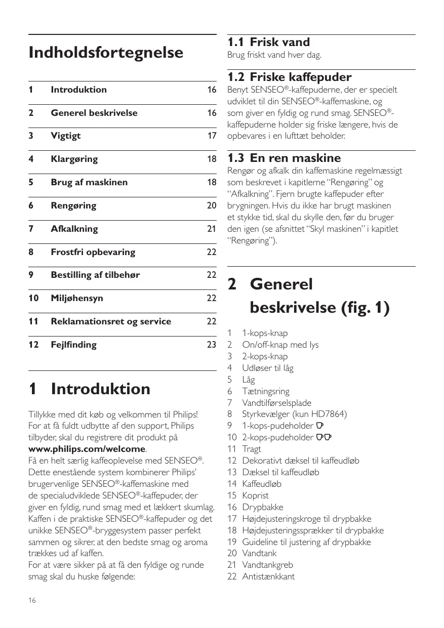 Reparation og eftersyn af maskinen skal altid foretages pä et autoriseret Philips- serviceværksted. Forsag Ikke selv at reparere maskinen, da garantien i sà fald bortfalder. Kom aldrig almindelig formalet kaffe elle beskadigede kaffepuder i SENSEO®-maskinen, da den vil stoppe til Brug ikke maskinen i kombination med en transformer, da dette kan resultere i en farlig situation: Sti altid maskinen pà et fladt og stabilt underlag Lad aldrig maskinen kare uden opsyn. koldt vand, inden den tages i brug for farste gang (se afsnittet “Klargaring”). Derved fldes vandkogeren med vand, hvilket er en betingelse for at maskinen kan fungere optimalt. + Brugikke SENSEO®-maskinen sammen med vandbladgarende midier der er baseret pà natrium. + Philips anbefaler dig kraftigt at afkalke denne SENSEO®-maskine hver 3. mäned. Hvis ikke maskinen bliver afkalket i tide og i henhold til de procedurer der er beskrevet i afsnittet “Afkalkning”. kan det fare til tekniske fejl + Afbryd aldrig afkalkningsprocessen. + Brug aldrig et afkalkningsmidde!, der er baseret pä mineralsk syre som feks. svovisyre, saltsyre, sulfaminsyre eller eddikesyre (feks eddike). Disse afkalkningsmidler kan skade din SENSEO®-kaffemaskine + Læg aldrig din SENSEO®-maskine pà siden. Sarg for at den altid stär oprejst - ogsä under transport. + Denne maskine er kun beregnet til normal anvendelse i hjemmet. Den er ikke beregnet “il brug i miljger som personalekgkkener i butikker pà kontorer pä gârde eller andre arbejdspladser Den er heller ikke beregnet til brug af gæster pà hoteller moteller bed and breakfasts eller i andre værelser til udlejning.