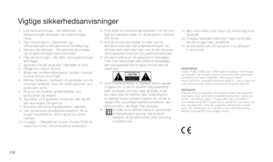 18. Cet appareil est de classe 2 ou dispose d'un équipement à double isolation électrique. Il a été conçu de sorte à ne requérir aucune connexion de sécurité pour la mise à la terre. 19. Il est nécessaire de surveiller les enfants afin d’éviter qu’ils ne jouent avec l’appareil. 20. Attention : Composants internes chauds. Ne pas faire fonctionner sans le diffuseur en verre. 21. Si le diffuseur a été retiré, évitez de regarder directement les témoins DEL Marques déposées Twilight, PURE, PURE sounds, le logo PURE, Imagination Technologies et le logo Imagination Technologies sont des marques de commerce ou des marques de commerce déposées de Imagination Technologies Limited. iPhone et iPod sont des marques de commerce d'Apple Inc., déposées aux États-Unis et dans d'autres pays. iPad est une marque de commerce d'Apple Inc.