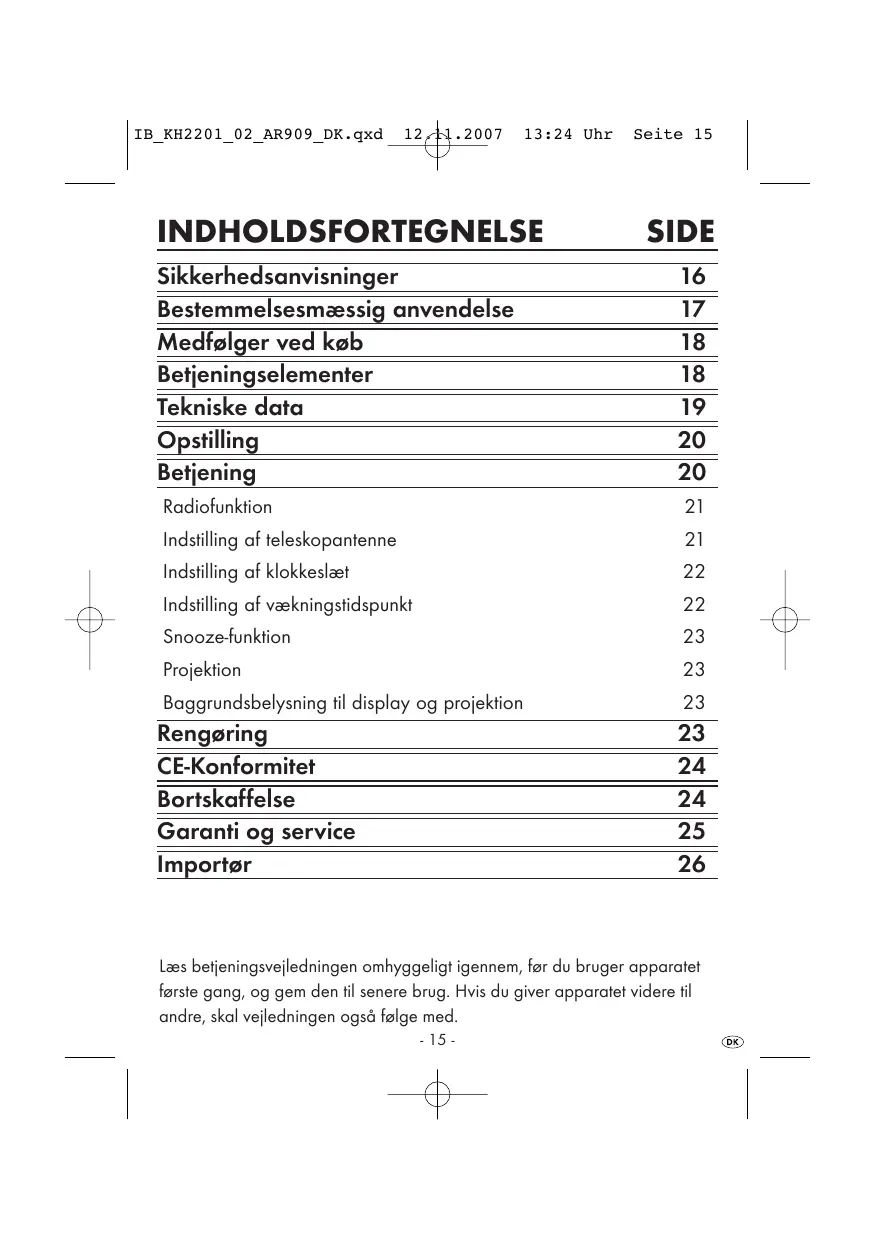 IB_KH2201 02 AR909 DK.qxd rar 13:24 Uhr Seite 15 INDHOLDSFORTEGNELSE SIDE Sikkerhedsanvisninger 16 Bestemmelsesmæssig anvendelse 17 Medfolger ved kgb 18 Betjeningselementer 18 Tekniske data 19 Opstilling 20 Betjening 20 Radiofunktion 21 Indstiling af teleskopantenne 21 Indstilling af klokkeslæt 22 Indstiling af vækningstidspunkt 22 Snooze-funktion 23 Projektion 23 Baggrundsbelysning til display og projektion 23 Rengaring 23 CE-Konformitet 24 Bortskaffelse 24 Garanti og service 25