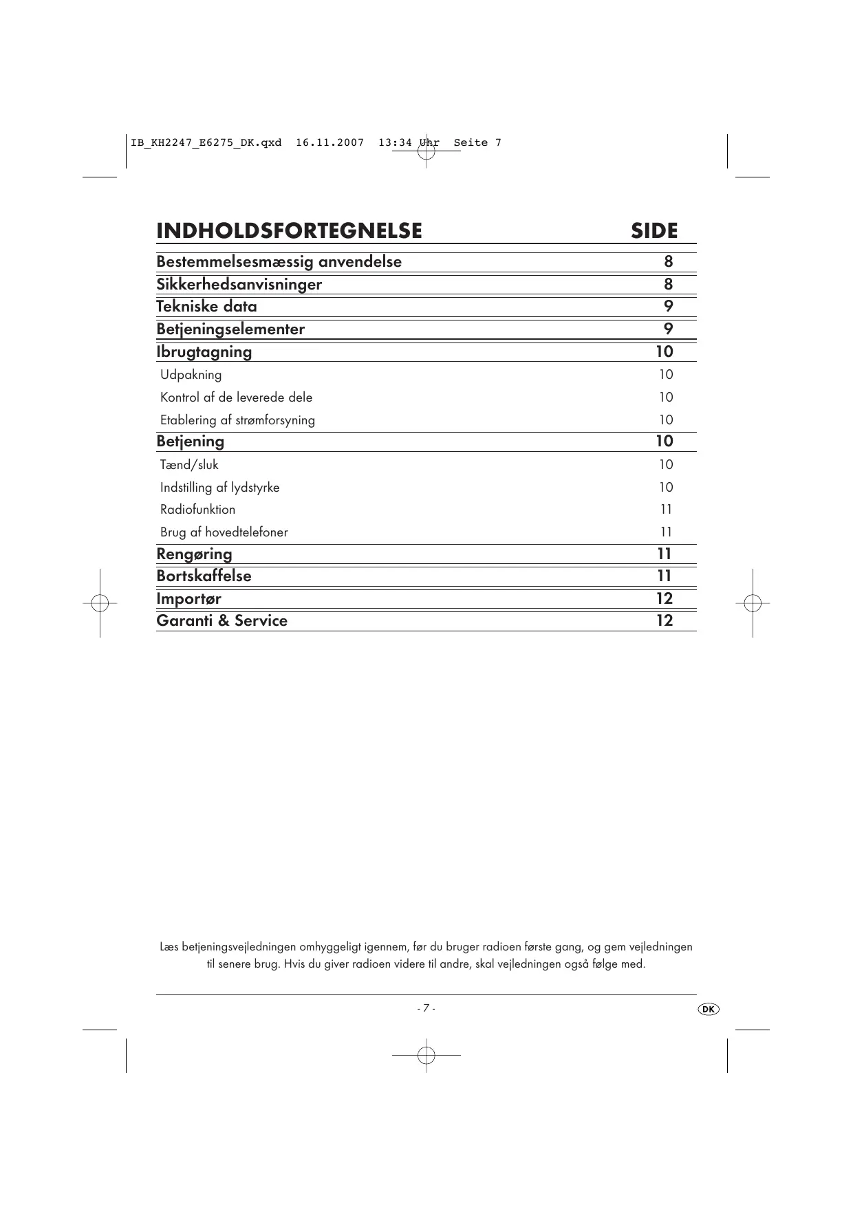 INDHOLDSFORTEGNELSE SIDE Bestemmelsesmæssig anvendelse 8 Sikkerhedsanvisninger 8 Tekniske data 9 Betjeningselementer 9 lbrugtagning 10 Udpakning 10 Kontrol af de leverede dele 10 Etablering af stramforsyning 10 Betjening 10 Tænd/sluk 10 Indkstllng af lydstyrke 10 Radiofunktion 1 Brug af hovedielefoner n Rengaring LL Bortskaffelse 1 Importor 12 Garanti & Service 12 Læs befjeningsveiledningen omhyggeligt igennem, far du bruger radioen farste gang, og gem vejledningen fil senere brug. Hvis du giver radioen videre til andre, skal veiledningen ogsà fslge med