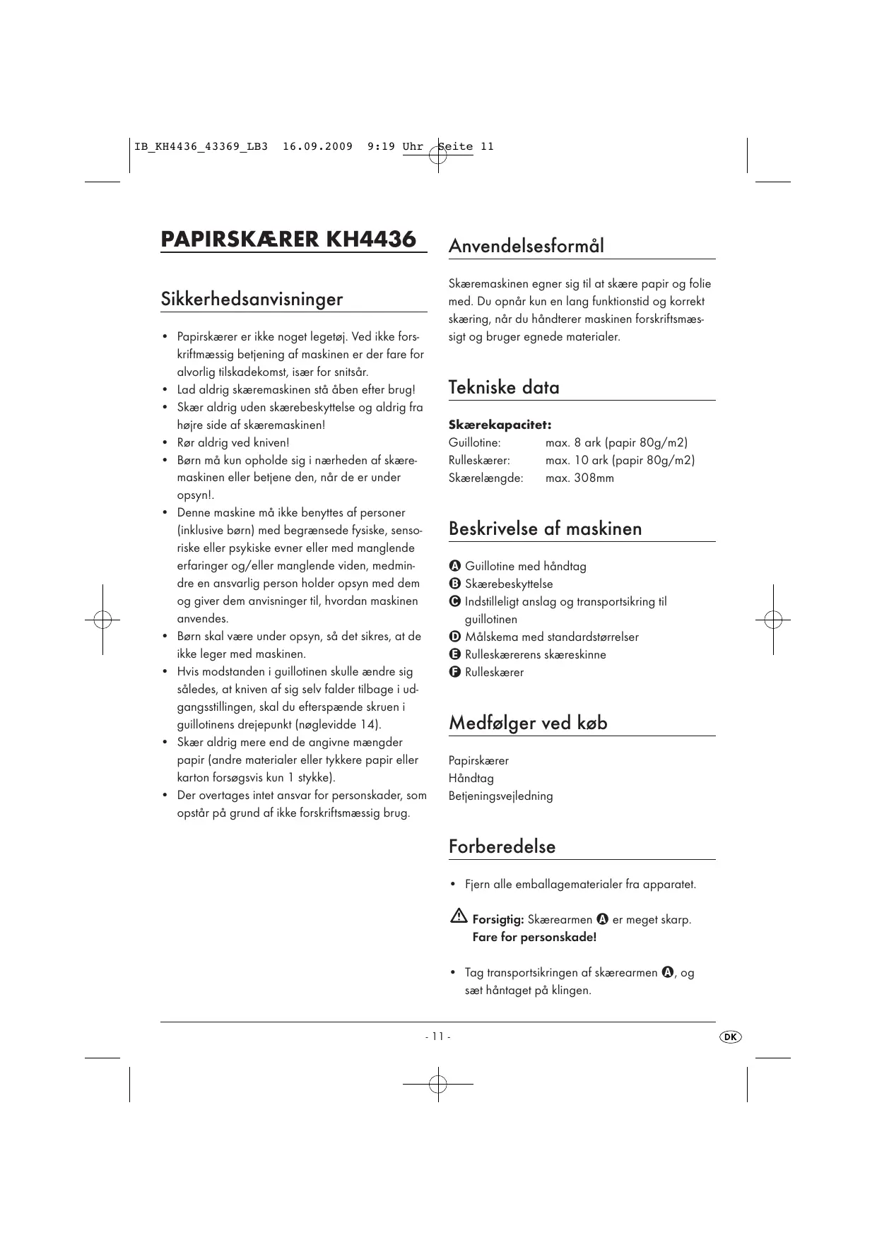 Sikkerhedsanvisninger + Papirskærer er ikke noget legetj. Ved ikke fors- krifimaæssig betjening af maskinen er der fare for alvorlig tilskadekomst, især for snitsär. + Lad aldrig skæremaskinen stà âben efter brugl + Skær aldrig uden skærebeskyttelse og aldrig fra hojre side af skæremaskinenl + Ror aldrig ved knivenl + Born mà kun opholde sig i nærheden af skære- maskinen eller betjene den, när de er under opsynl + Denne maskine mà ikke benyttes af personer {inklusive barn) med begrænsede fysiske, senso- riske eller psykiske evner eller med manglende erfaringer og/eller manglende viden, medmin- dre en ansvarlig person holder opsyn med dem og giver dem anvisninger til, hvordan maskinen anvendes. + Born skal være under opsyn, sä det sikres, at de ikke leger med maskinen. Hvis modstanden i guillotinen skulle ændre sig säledes, at kniven af sig selv falder tilbage i ud- gangsstilingen, skal du efterspænde skruen i guillotinens drejepunkt (naglevidde 14). + Skær aldrig mere end de angivne mængder papir [andre materialer eller tykkere papir eller karton forsagsvis kun 1 stykke]. +_ Der overtages intet ansvar for personskader, som opstär pà grund af ikke forskrifismæssig brug. Anvendelsesformäl Skæremaskinen egner sig til at skære papir og folie med. Du opnr kun en lang funktionstid og korrekt skæring, när du händierer maskinen forskrifismæs- sigt og bruger egnede materialer. Tekniske data Skærekapacitet: Guillotine: Rulleskærer: max. 8 ark (papir 80g/m2) max. 10 ark (papir 80g/m2) Skærelængde: max. 308mm Beskrivelse af maskinen © Guillotine med händtag © Skærebeskyttelse @ Indstlleligt anslag og transportsikring til guillotinen © Mälskema med standardstarrelser @ Rulleskærerens skæreskinne @ Rulleskærer Medfolger ved kob Papirskærer Händtag Betjeningsveiledning Forberedelse +_ Fjern alle emballagematerialer fra apparatet. À Forsigtig: Skærearmen @ er meget skarp. Fare for personskadel + Tag transportsikringen af skærearmen @, og sæt häntaget pà klingen.