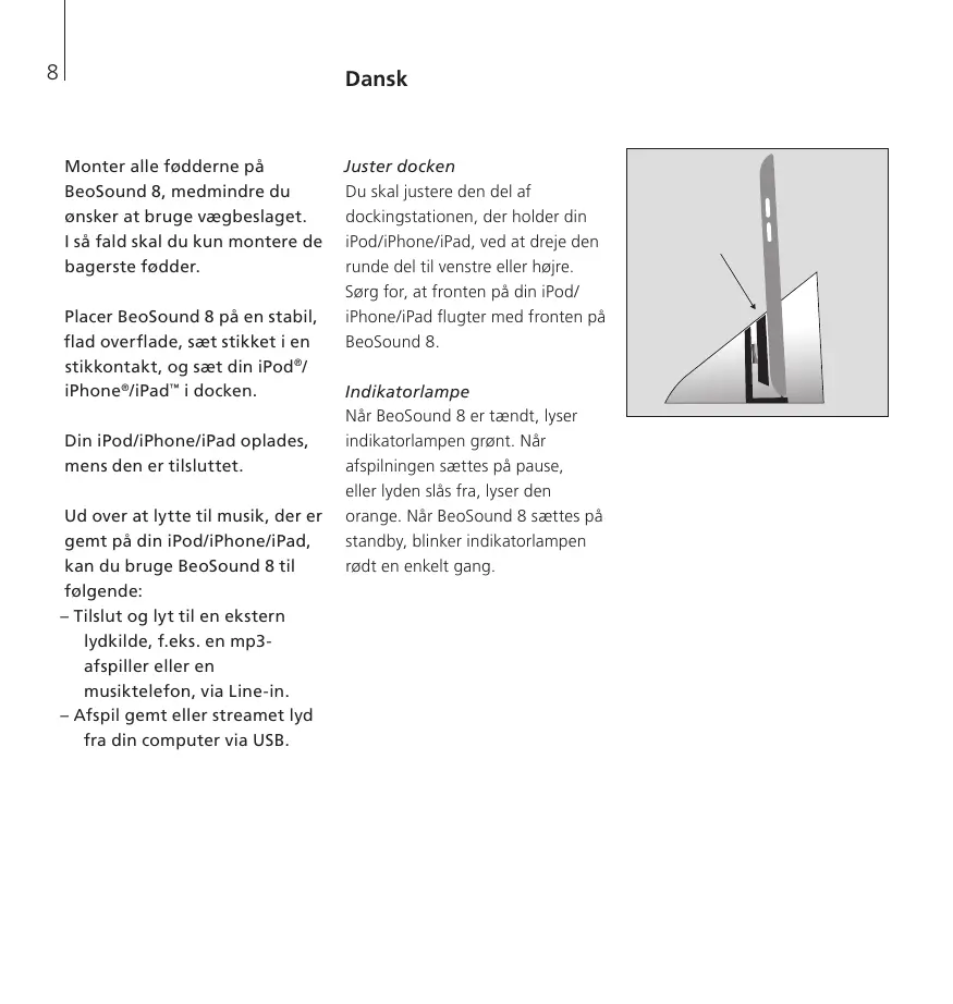 Placez le BeoSound 8 sur une surface plate et stable, connectez le câble d’alimentation et logez votre iPod®/iPhone®/iPad™.