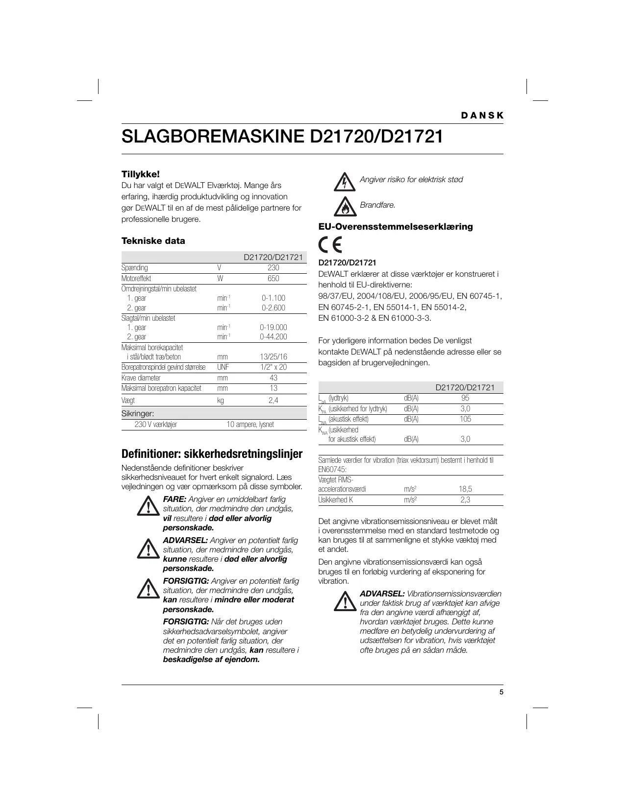 2,4 10 ampere, lysnet Definitioner: sikkerhedsretningslinjer Nedenstående definitioner beskriver sikkerhedsniveauet for hvert enkelt signalord. Læs vejledningen og vær opmærksom på disse symboler. FARE: Angiver en umiddelbart farlig situation, der medmindre den undgås, vil resultere i død eller alvorlig personskade. ADVARSEL: Angiver en potentielt farlig situation, der medmindre den undgås, kunne resultere i død eller alvorlig personskade. FORSIGTIG: Angiver en potentielt farlig situation, der medmindre den undgås, kan resultere i mindre eller moderat personskade. FORSIGTIG: Når det bruges uden sikkerhedsadvarselsymbolet, angiver det en potentielt farlig situation, der medmindre den undgås, kan resultere i beskadigelse af ejendom. D21720/D21721 DEWALT erklærer at disse værktøjer er konstrueret i henhold til EU-direktiverne: 98/37/EU, 2004/108/EU, 2006/95/EU, EN 60745-1, EN 60745-2-1, EN 55014-1, EN 55014-2, EN 61000-3-2 & EN 61000-3-3. For yderligere information bedes De venligst kontakte DEWALT på nedenstående adresse eller se bagsiden af brugervejledningen. LpA (lydtryk) KPA (usikkerhed for lydtryk) LWA (akustisk effekt) KWA (usikkerhed for akustisk effekt) dB(A) dB(A) dB(A) D21720/D21721 3,0