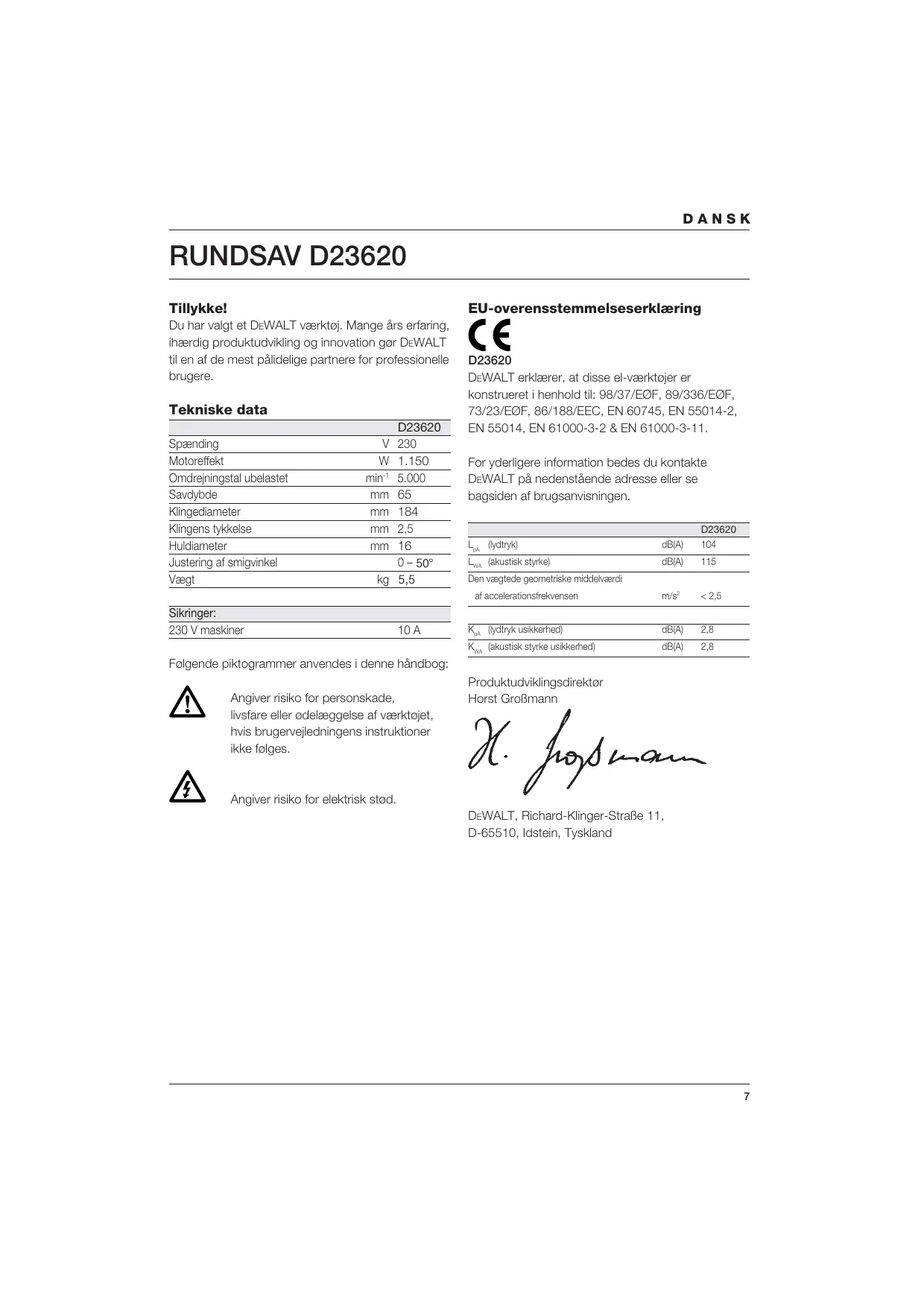 m/s2 < 2,5 KpA (lydtryk usikkerhed) dB(A) 2,8 KWA (akustisk styrke usikkerhed) dB(A) 2,8 Den vægtede geometriske middelværdi af accelerationsfrekvensen Sikringer: 230 V maskiner 10 A Følgende piktogrammer anvendes i denne håndbog: Angiver risiko for personskade, livsfare eller ødelæggelse af værktøjet, hvis brugervejledningens instruktioner ikke følges. Produktudviklingsdirektør Horst Großmann Angiver risiko for elektrisk stød. DEWALT, Richard-Klinger-Straße 11, D-65510, Idstein, Tyskland