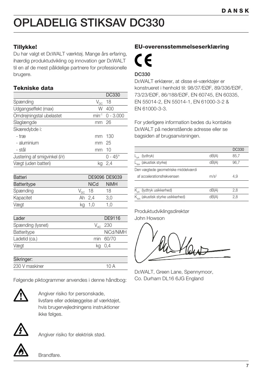 kg 2,4 DC330 DEWALT erklærer, at disse el-værktøjer er konstrueret i henhold til: 98/37/EØF, 89/336/EØF, 73/23/EØF, 86/188/EØF, EN 60745, EN 60335, EN 55014-2, EN 55014-1, EN 61000-3-2 & EN 61000-3-3. For yderligere information bedes du kontakte DEWALT på nedenstående adresse eller se bagsiden af brugsanvisningen. DC330 LpA (lydtryk) dB(A) 85,7 LWA (akustisk styrke) dB(A) 96,7 m/s2 4,9 KpA (lydtryk usikkerhed) dB(A) 2,8 KWA (akustisk styrke usikkerhed) dB(A) 2,8 Den vægtede geometriske middelværdi Batteri Batteritype Spænding Kapacitet Vægt DE9096 NiCd VDC 18 Ah 2,4 kg 1,0 Lader Spænding (lysnet) Batteritype Ladetid (ca.) Vægt DE9039 NiMH 3,0 1,0 DE9116 VAC 230 NiCd/NiMH min 60/70 kg 0,4 Sikringer: 230 V maskiner af accelerationsfrekvensen Produktudviklingsdirektør John Howson 10 A Følgende piktogrammer anvendes i denne håndbog: DEWALT, Green Lane, Spennymoor, Co. Durham DL16 6JG England Angiver risiko for personskade, livsfare eller ødelæggelse af værktøjet, hvis brugervejledningens instruktioner ikke følges. Angiver risiko for elektrisk stød. Brandfare.