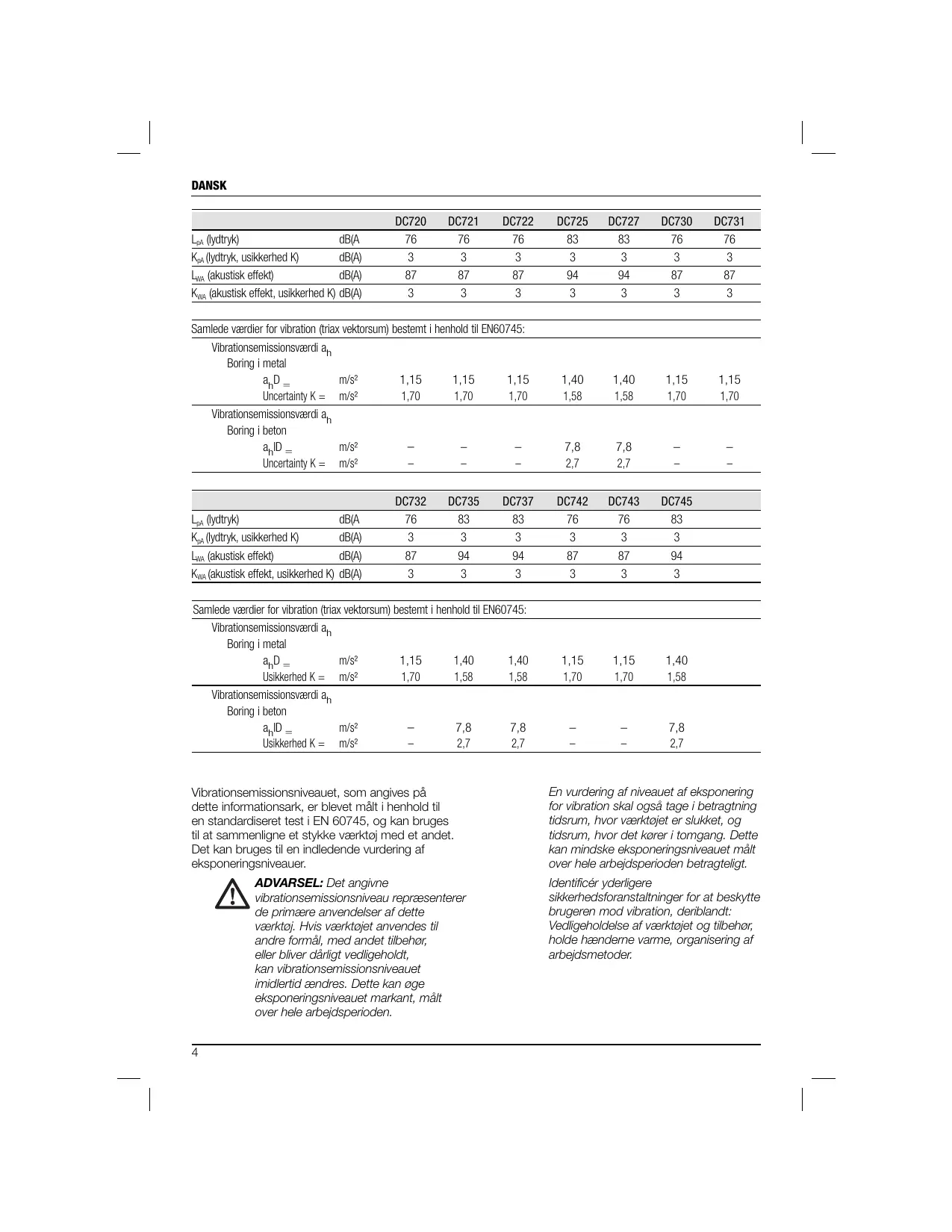 Samlede værdier for vibration (triax vektorsum) bestemt i henhold til EN60745: Vibrationsemissionsværdi ah Boring i metal ahD = m/s² 1,15 1,40 1,40 Usikkerhed K = m/s² 1,70 1,58 1,58 Vibrationsemissionsværdi ah Boring i beton ahID = m/s² 7,8 7,8 Usikkerhed K = m/s² 2,7 2,7 Vibrationsemissionsniveauet, som angives på dette informationsark, er blevet målt i henhold til en standardiseret test i EN 60745, og kan bruges til at sammenligne et stykke værktøj med et andet. Det kan bruges til en indledende vurdering af eksponeringsniveauer. ADVARSEL: Det angivne vibrationsemissionsniveau repræsenterer de primære anvendelser af dette værktøj. Hvis værktøjet anvendes til andre formål, med andet tilbehør, eller bliver dårligt vedligeholdt, kan vibrationsemissionsniveauet imidlertid ændres. Dette kan øge eksponeringsniveauet markant, målt over hele arbejdsperioden.