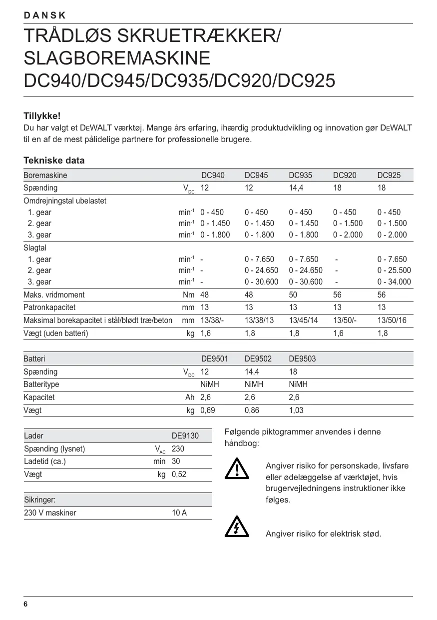 | Boremaskine | DC940 | DC945 | DC935 | DC920 | DC925 | |