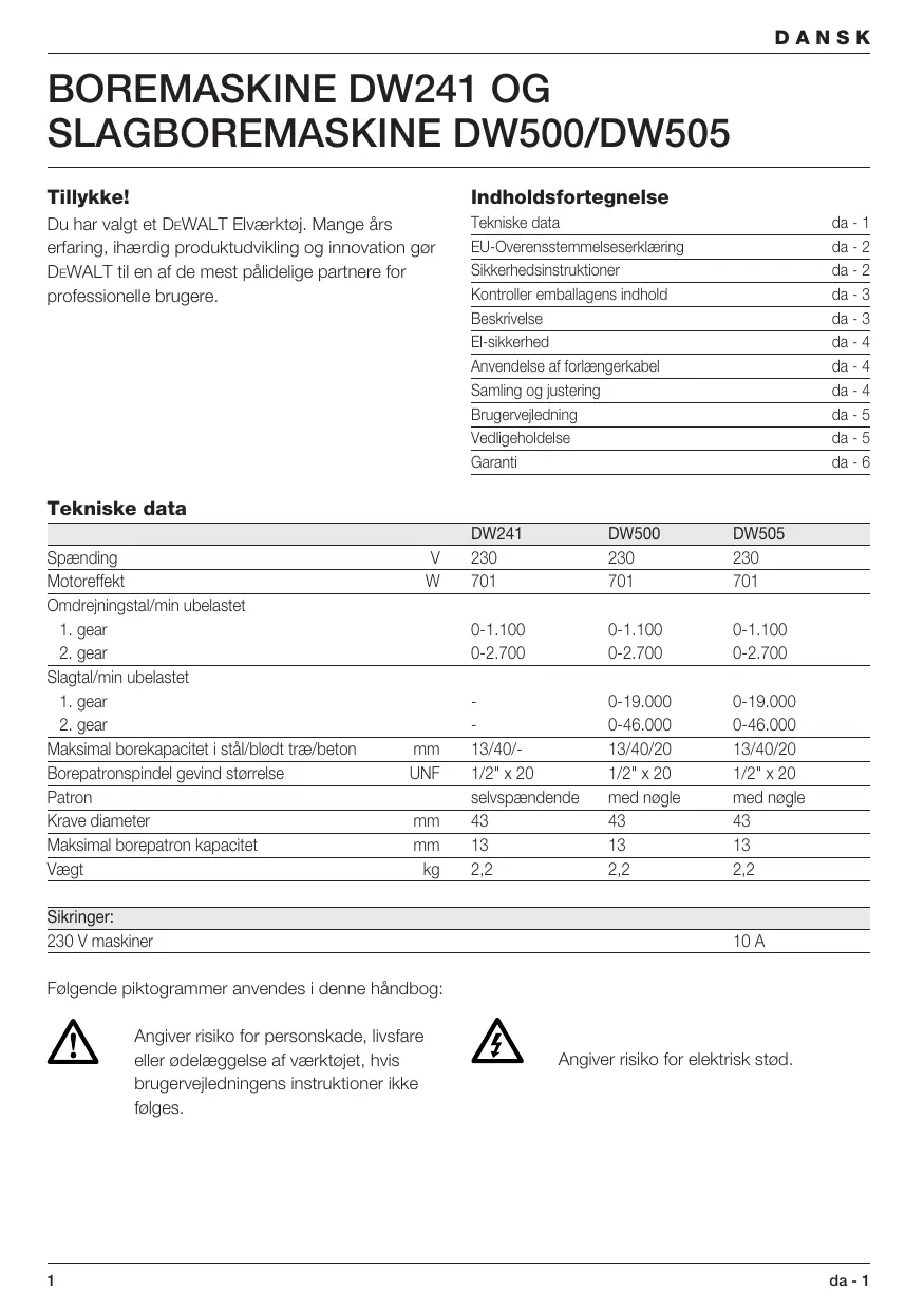 Tillykke! Indholdsfortegnelse Du har valgt et DEWALT Elværktøj. Mange års erfaring, ihærdig produktudvikling og innovation gør DEWALT til en af de mest pålidelige partnere for professionelle brugere. Tekniske data EU-Overensstemmelseserklæring Sikkerhedsinstruktioner Kontroller emballagens indhold Beskrivelse El-sikkerhed Anvendelse af forlængerkabel Samling og justering Brugervejledning Vedligeholdelse Garanti da - 1 da - 2 da - 2 da - 3 da - 3 da - 4 da - 4 da - 4 da - 5 da - 5 da - 6 Tekniske data Spænding Motoreffekt Omdrejningstal/min ubelastet