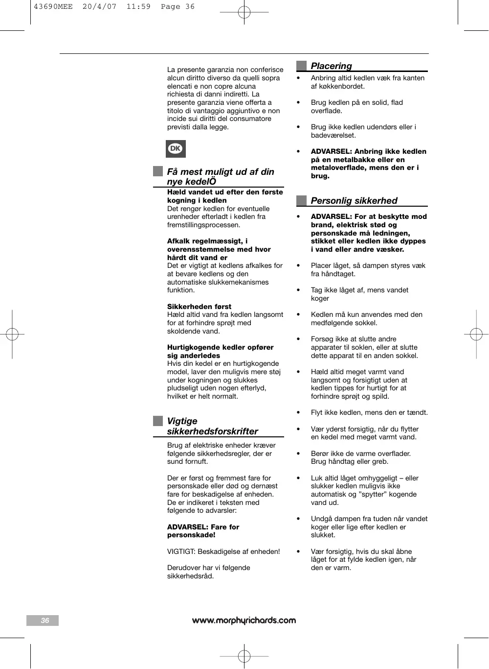 Hvis der opstår fejl efter de første 28 dage efter købsdatoen og inden 24 måneder efter købsdatoen, skal du kontakte Morphy Richards og opgive produktets model- og serienummer eller skrive til Morphy Richards på den anførte adresse. Du bliver bedt om at returnere produktet (forsvarligt indpakket) til nedenstående adresse sammen med en kopi af kvitteringen. Rengøring ADVARSEL: Du skal altid trække stikket ud af stikkontakten og lade kedlen køle af før rengøring. Aftør kedlens yderside med en fugtig klud. Den defekte enhed repareres eller ombyttes derefter, sædvanligvis inden for 7 arbejdsdage efter modtagelse, dog med forbehold for undtagelserne som beskrevet nedenfor (1-6). Hvis enheden af en eller anden grund ombyttes inden for garantiperioden på to år, beregnes garantien på den nye enhed fra den