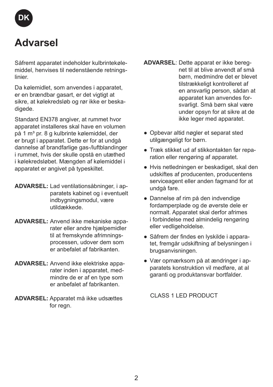 CLASS 1 LED PRODUCT ADVARSEL:Apparatet må ikke udsættes for regn.