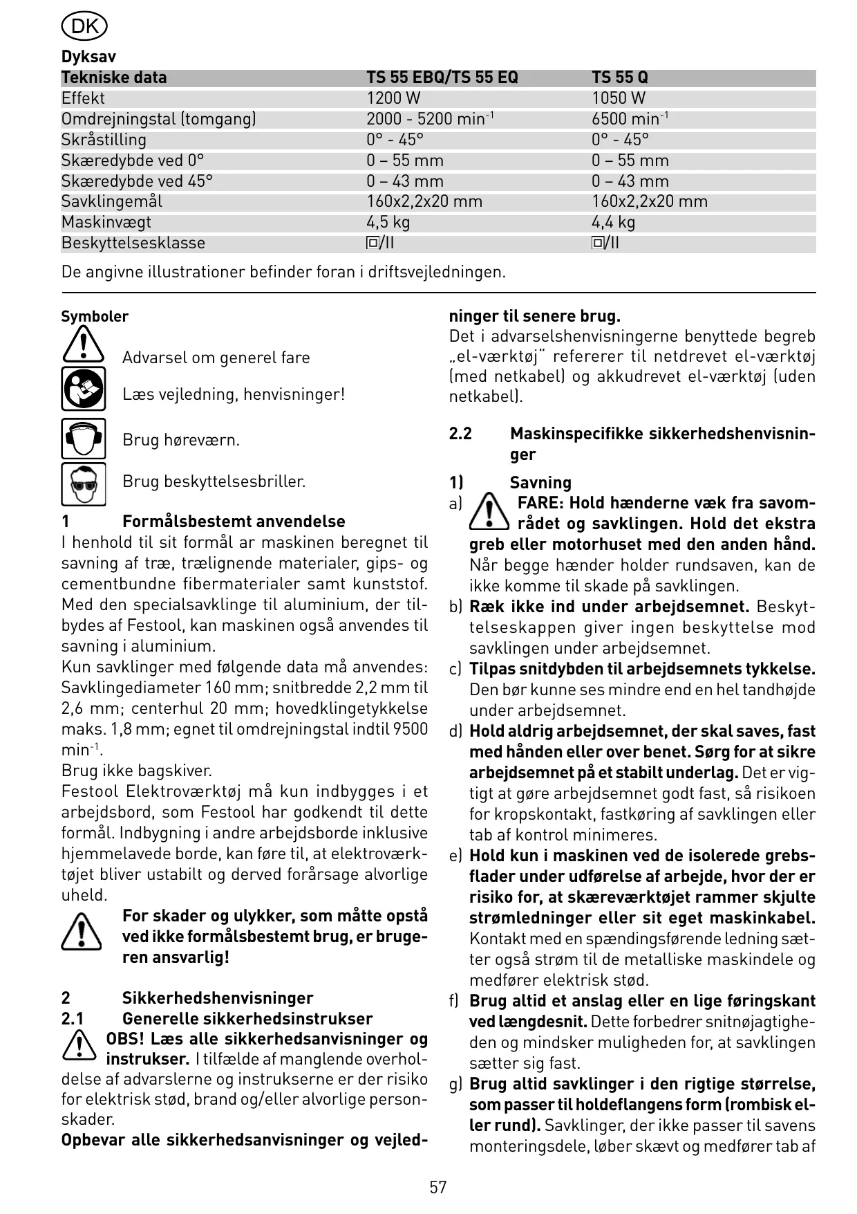1200 W 2000 - 5200 min-1 0° - 45° 0 – 55 mm 0 – 43 mm 160x2,2x20 mm 4,5 kg /II TS 55 Q 1050 W 6500 min-1 0° - 45° 0 – 55 mm 0 – 43 mm 160x2,2x20 mm 4,4 kg /II De angivne illustrationer befinder foran i driftsvejledningen. Læs vejledning, henvisninger! ninger til senere brug. Det i advarselshenvisningerne benyttede begreb „el-værktøj“ refererer til netdrevet el-værktøj (med netkabel) og akkudrevet el-værktøj (uden netkabel). Brug høreværn.
