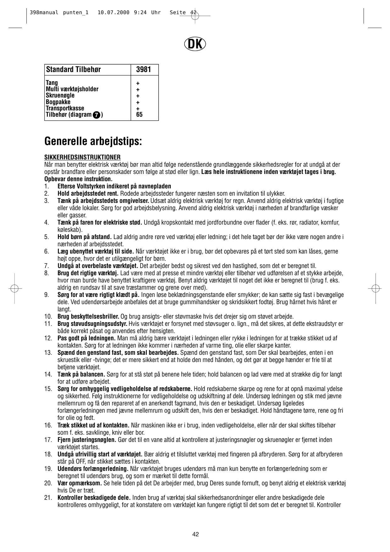 Generelle arbejdstips: SIKKERHEDSINSTRUKTIONER Når man benytter elektrisk værktøj bør man altid følge nedenstående grundlæggende sikkerhedsregler for at undgå at der opstår brandfare eller personskader som følge at stød eller lign. Læs hele instruktionene inden værktøjet tages i brug. Opbevar denne instruktion. 1. Efterse Voltstyrken indikeret på navnepladen 2. Hold arbejdsstedet rent. Rodede arbejdssteder fungerer næsten som en invitation til ulykker. 3. Tænk på arbejdsstedets omgivelser. Udsæt aldrig elektrisk værktøj for regn. Anvend aldrig elektrisk værktøj i fugtige eller våde lokaler. Sørg for god arbejdsbelysning. Anvend aldrig elektrisk værktøj i nærheden af brandfarlige væsker eller gasser. 4. Tænk på faren for elektriske stød. Undgå kropskontakt med jordforbundne over flader (f. eks. rør, radiator, komfur, køleskab). 5. Hold børn på afstand. Lad aldrig andre røre ved værktøj eller ledning; i det hele taget bør der ikke være nogen andre i nærheden af arbejdsstedet. 6. Læg ubenyttet værktøj til side. Når værktøjet ikke er i brug, bør det opbevares på et tørt sted som kan låses, gerne højt oppe, hvor det er utilgængeligt for børn. 7. Undgå at overbelaste værktøjet. Det arbejder bedst og sikrest ved den hastighed, som det er beregnet til. 8. Brug det rigtige værktøj. Lad være med at presse et mindre værktøj eller tilbehør ved udførelsen af et stykke arbejde, hvor man burde have benyttet kraftigere værktøj. Benyt aldrig værktøjet til noget det ikke er beregnet til (brug f. eks. aldrig en rundsav til at save træstammer og grene over med). 9. Sørg for at være rigtigt klædt på. Ingen løse beklædningsgenstande eller smykker; de kan sætte sig fast i bevægelige dele. Ved udendørsarbejde anbefales det at bruge gummihandsker og skridsikkert fodtøj. Brug hårnet hvis håret er langt. 10. Brug beskyttelsesbriller. Og brug ansigts- eller støvmaske hvis det drejer sig om støvet arbejde. 11. Brug støvudsugningsudstyr. Hvis værktøjet er forsynet med støvsuger o. lign., må det sikres, at dette ekstraudstyr er både korrekt påsat og anvendes efter hensigten. 12. Pas godt på ledningen. Man må aldrig bære værktøjet i ledningen eller rykke i ledningen for at trække stikket ud af kontakten. Sørg for at ledningen ikke kommer i nærheden af varme ting, olie eller skarpe kanter. 13. Spænd den genstand fast, som skal bearbejdes. Spænd den genstand fast, som Der skal bearbejdes, enten i en skruestik eller -tvinge; det er mere sikkert end at holde den med hånden, og det gør at begge hænder er frie til at betjene værktøjet. 14. Tænk på balancen. Sørg for at stå støt på benene hele tiden; hold balancen og lad være med at strække dig for langt for at udføre arbejdet. 15. Sørg for omhyggelig vedligeholdelse af redskaberne. Hold redskaberne skarpe og rene for at opnå maximal ydelse og sikkerhed. Følg instruktionerne for vedligeholdelse og udskiftning af dele. Undersøg ledningen og stik med jævne mellemrum og få den repareret af en anerkendt fagmand, hvis den er beskadiget. Undersøg ligeledes forlængerledningen med jævne mellemrum og udskift den, hvis den er beskadiget. Hold håndtagene tørre, rene og fri for olie og fedt. 16. Træk stikket ud af kontakten. Når maskinen ikke er i brug, inden vedligeholdelse, eller når der skal skiftes tilbehør som f. eks. savklinge, kniv eller bor. 17. Fjern justeringsnøglen. Gør det til en vane altid at kontrollere at justeringsnøgler og skruenøgler er fjernet inden værktøjet startes. 18. Undgå ufrivillig start af værktøjet. Bær aldrig et tilsluttet værktøj med fingeren på afbryderen. Sørg for at afbryderen står på OFF, når stikket sættes i kontakten. 19. Udendørs forlængerledning. Når værktøjet bruges udendørs må man kun benytte en forlængerledning som er beregnet til udendørs brug, og som er mærket til dette formål. 20. Vær opmærksom. Se hele tiden på det De arbejder med, brug Deres sunde fornuft, og benyt aldrig et elektrisk værktøj hvis De er træt. 21. Kontroller beskadigede dele. Inden brug af værktøj skal sikkerhedsanordninger eller andre beskadigede dele kontrolleres omhyggeligt, for at konstatere om værktøjet kan fungere rigtigt til det som det er beregnet til. Kontroller