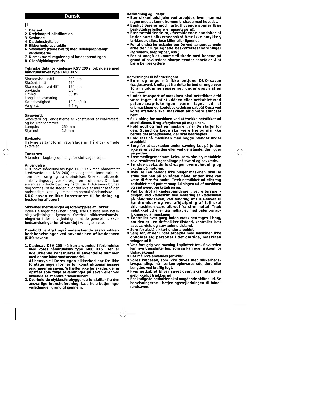 - For at undgå at komme til skade med benene på grund af savkædens skarpe tænder anbefaler vi at bære benbeskyttere. Tekniske data for kædesav KSV 200 i forbindelse med håndrundsaven type 1400 HKS: Skæredybde indtil Skråsnit indtil Skæredybde ved 45° Savkæde Drivled Langtidsoliesmøring Kædehastighed Vægt ca. 200 mm 45° 150 mm 3/8" 36 stk 12,9 m/sek. 5,4 kg Savsværd: Savsværd og vendestjerne er konstrueret af kvalitetsstål og induktionshærdet. Længde: 250 mm Styrenot: 1,3 mm Savkæde: Halvmejseltandform, returslagarm, hårdforkromede skæreled. Tanddrev: 9 tænder – kuglelejeophængt for støjsvagt arbejde. Anvendelse DUO-save (håndrundsav type 1400 HKS med påmonteret kædesavforsats KSV 200) er velegnet til tømrerarbejde som f.eks. smig og træforbindelser. Selv komplicerede sinksavningsopgaver klares uden problemer. Den kan anvendes til både blødt og hårdt træ. DUO-saven bruges dog fortrinsvist de steder, hvor det ikke er muligt at få den nødvendige skæredybde med en normal håndrundsav. DUO-saven er ikke konstrueret til fældning og beskæring af træer! Sikkerhedshenvisninger og forebyggelse af ulykker Inden De tager maskinen i brug, skal De læse hele betjeningsvejledningen igennem. Overhold sikkerhedsanvisningerne i denne vejledning samt de generelle sikkerhedsanvisninger for el-værktøj i vedlagte hæfte. Overhold venligst også nedenstående ekstra sikkerhedshenvisninger ved anvendelsen af kædesaven (DUO-saven):