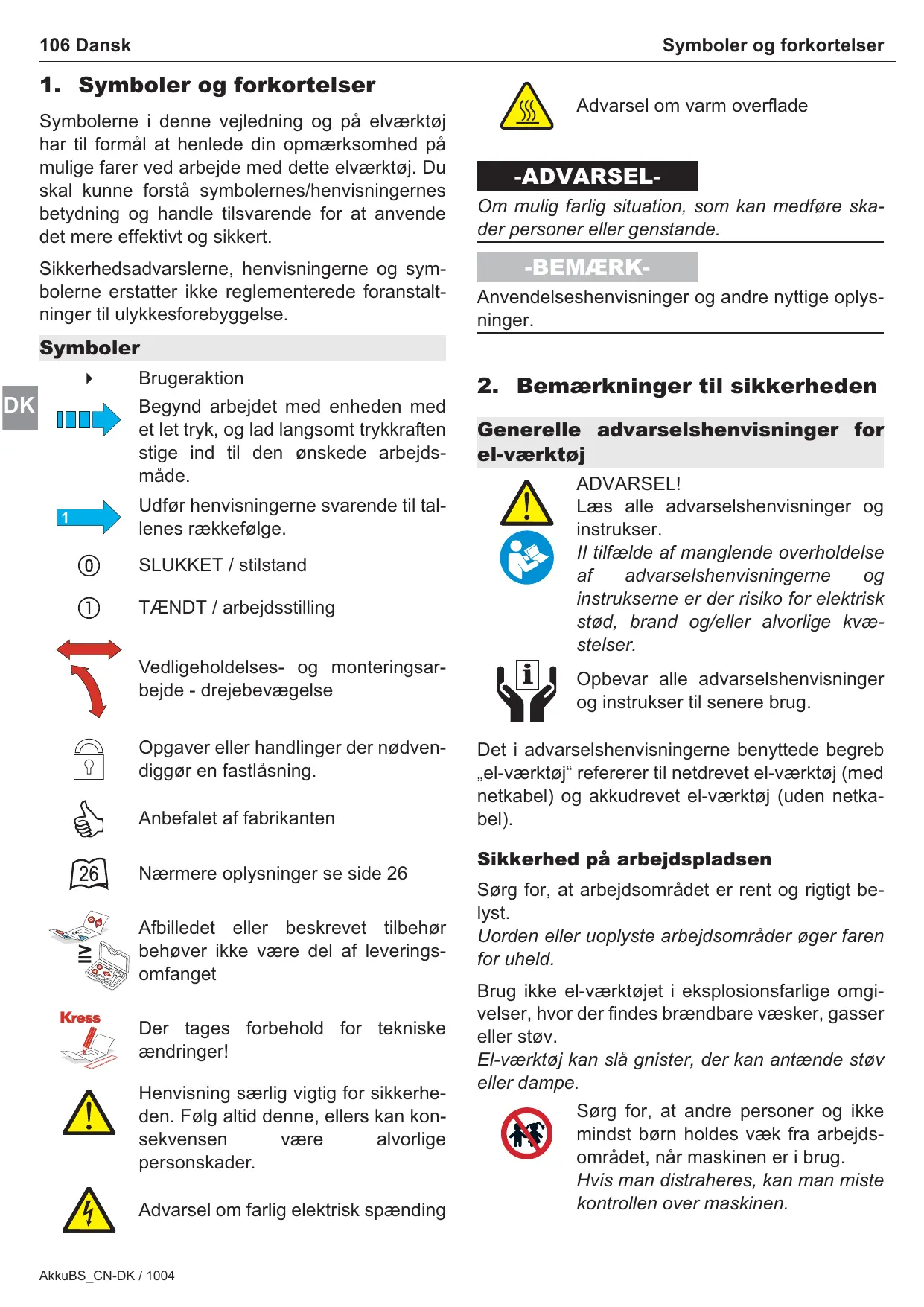 Symbolerne i denne vejledning og på elværktøj har til formål at henlede din opmærksomhed på mulige farer ved arbejde med dette elværktøj. Du skal kunne forstå symbolernes/henvisningernes betydning og handle tilsvarende for at anvende det mere effektivt og sikkert. Sikkerhedsadvarslerne, henvisningerne og symbolerne erstatter ikke reglementerede foranstaltninger til ulykkesforebyggelse. Advarsel om varm overflade -ADVARSELOm mulig farlig situation, som kan medføre skader personer eller genstande. -BEMÆRKAnvendelseshenvisninger og andre nyttige oplysninger. Symboler