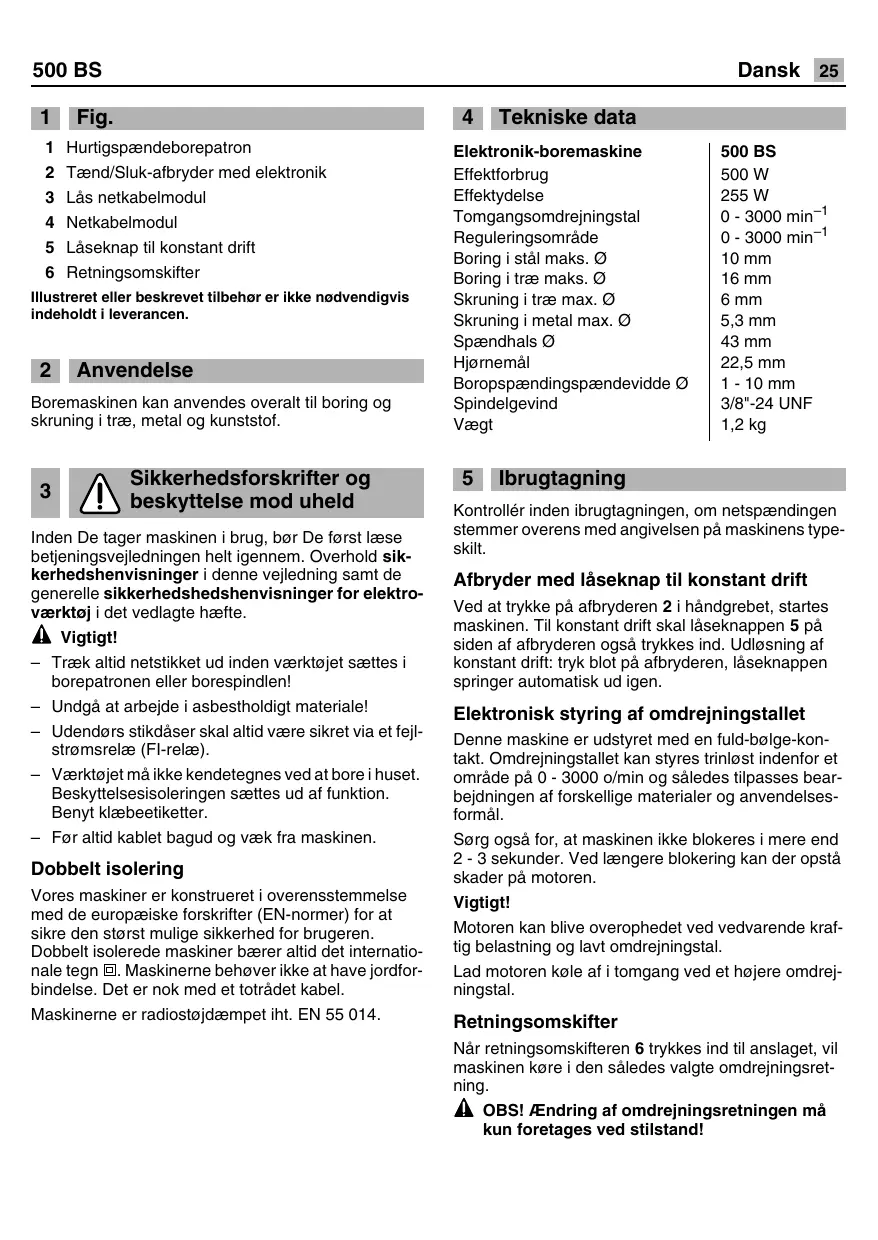 500 BS Dansk 25 1 Fig. 4 Tekniske data 1 Hurtigspændeborepatron Elektronik-boremaskine 500 BS 2 Tænd/Sluk-afbryder med elektronik Effektforbrug 500 W 3 Läs netkabelmodul Effektydelse 255 W 4 Netkabelmodul Tomgangsomariningstal 2: 3000 min à : eguleringsomräde - min 5 Läseknap til konstant drift Boring i stél maks. 10 mm 6 Retningsomskifter Boring i træ maks. 16mm Illustreret eller beskrevet tilbehor er ikke nodvendigvis Skruning i træ max. © 6 mm indeholdt | leverancen. Skruning i metal max. 5,3 mm Spændhals 43 mm 2 Anvendel Hjormemäl 22,5 mm CAES Boropspændingspændevidde S | 1-10 mm Boremaskinen kan anvendes overalt til boring og Spindelgevind 8/8"-24 UNF skruning itræ, metal og kunststof. Vægt 1.2kg 3 Sikkerhedsforskrifter og N beskyttelse mod uheld Inden De tager maskinen i brug, bar De forst læse betjeningsvelledningen helt igennem. Overhold sik- kerhedshenvisninger i denne vejledning samt de generelle sikkerhedshedshenvisninger for elektro- værktoj i det vedlagte hæîte. À vigtiot! = Træk allid netstikket ud inden værktojet sættes i borepatronen eller borespindlen! — Undgä at arbejde i asbestholdigt materialel — Udendors stikdäser skal altid være sikret via et fejl- stromsrelæ (Fl-relæ). — Værktojet màikke kendetegnes ved at bore i huset. Beskyttelsesisoleringen sættes ud af funktion. Benyt klæbeetiketter. — For altid kablet bagud og væk fra maskinen. Dobbelt isolering Vores maskiner er konstrueret i overensstemmelse med de europæiske forskrifter (EN-normer) for at sikre den storst mulige sikkerhed for brugeren. Dobbelt isolerede maskiner bærer altid det intermatio- nale tegn El. Maskineme behaver ikke at have jordtor- bindelse. Det er nok med et toträdet kabel. Maskinerne er radiostojdæmpet iht. EN 55 014. 5 lIbrugtagning Kontrollér inden ibrugtagningen, om netspændingen stemmer overens med angivelsen pâ maskinens type- ski. Afbryder med läseknap til konstant drift Ved at trykke pà afbryderen 2 i händgrebet, startes maskinen. Til konstant drift skal laseknappen 5 pà siden af afbryderen ogsà trykkes ind. Udiosning af konstant drift: tryk blot pà afbryderen, làseknappen springer automatisk ud igen. Elektronisk styring af omdrejningstallet Denne maskine er udstyret med en fuld-bolge-kon- takt. Omdrejningstallet kan styres trinlost indenfor et omräde pà 0 - 3000 o/min og säledes tilpasses bear- bejdningen af forskellige materialer og anvendelses- formäl. Sorg ogsà for, at maskinen ikke blokeres i mere end