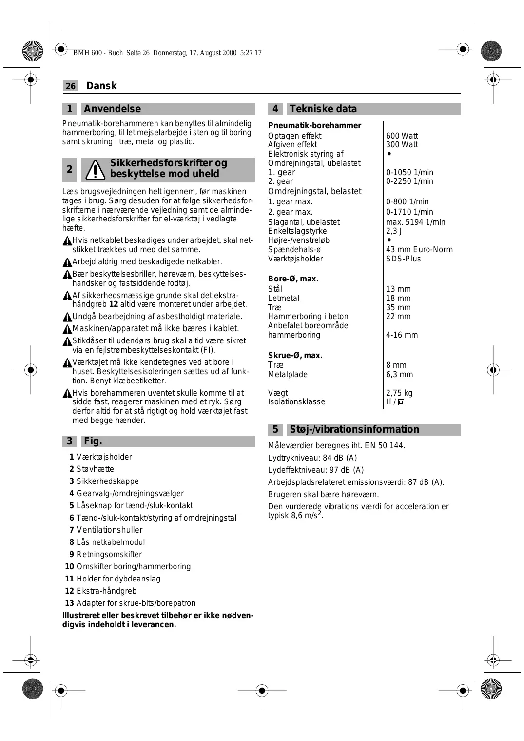 Tekniske data Støj-/vibrationsinformation Måleværdier beregnes iht. EN 50 144. Lydtrykniveau: 84 dB (A) Lydeffektniveau: 97 dB (A) Arbejdspladsrelateret emissionsværdi: 87 dB (A). Brugeren skal bære høreværn. Den vurderede vibrations værdi for acceleration er typisk 8,6 m/s2. BMH 600 - Buch Seite 27 Donnerstag, 17. August 2000 5:27 17 Dansk