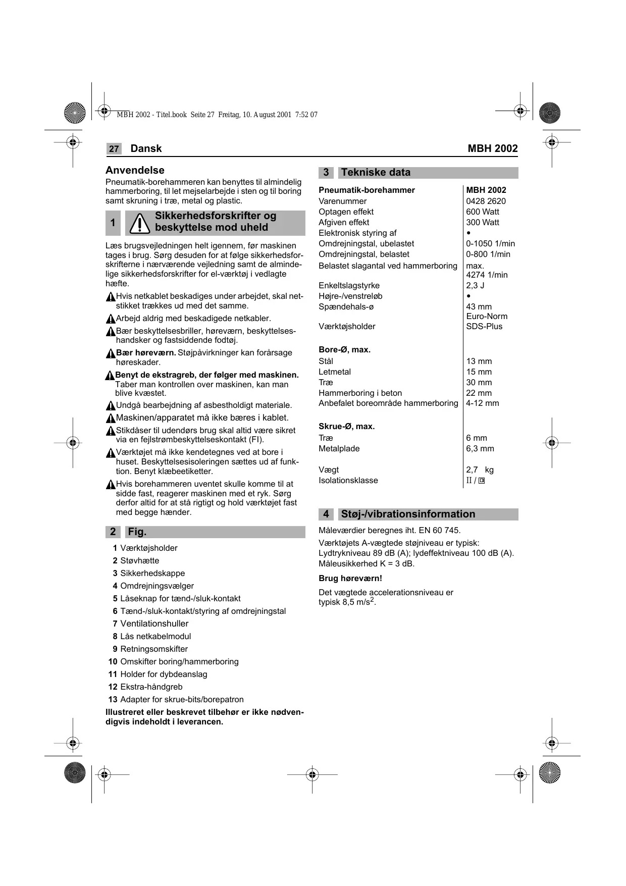 Støj-/vibrationsinformation Måleværdier beregnes iht. EN 60 745. Værktøjets A-vægtede støjniveau er typisk: Lydtrykniveau 89 dB (A); lydeffektniveau 100 dB (A). Måleusikkerhed K = 3 dB. Brug høreværn! Det vægtede accelerationsniveau er typisk 8,5 m/s2. MBH 2002 - Titel.book Seite 28 Freitag, 10. August 2001 7:52 07 MBH 2002