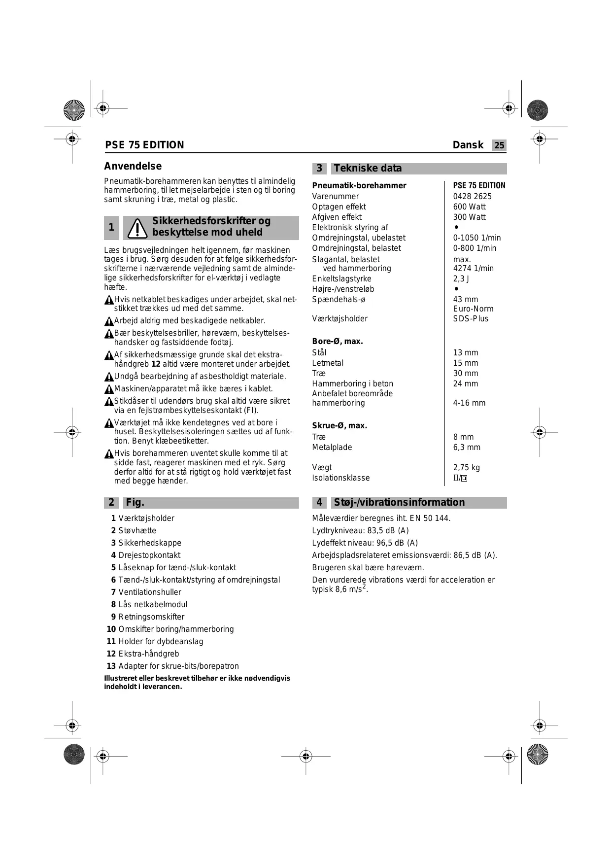 Fig. Værktøjsholder Støvhætte Sikkerhedskappe Drejestopkontakt Låseknap for tænd-/sluk-kontakt Tænd-/sluk-kontakt/styring af omdrejningstal Ventilationshuller Lås netkabelmodul Retningsomskifter Omskifter boring/hammerboring Holder for dybdeanslag Ekstra-håndgreb Adapter for skrue-bits/borepatron Illustreret eller beskrevet tilbehør er ikke nødvendigvis indeholdt i leverancen. Dansk
