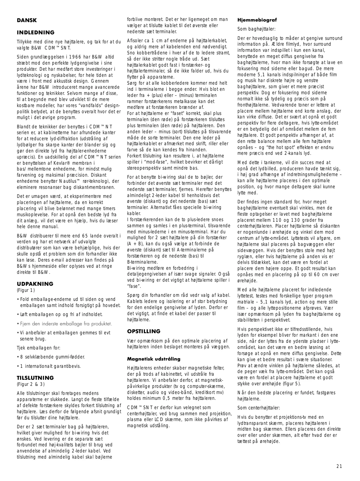 DANSK INDLEDNING Tillykke med dine nye højttalere, og tak for at du valgte B&W CDM™SNT. Siden grundlæggelsen i 1966 har B&W altid stræbt mod den perfekte lydgengivelse i sine produkter. Det har medført store investeringer i lydteknologi og nyskabelser, for hele tiden at være i front med akkustisk design. Gennem årene har B&W introduceret mange avancerede funktioner og teknikker. Selvom mange af disse, til at begynde med blev udviklet til de mere kostbare modeller, har vores “vandfalds” designpolitik betydet, at de benyttes overalt hvor det er muligt i det øvrige program. Blandt de teknikker der benyttes i CDM™NT serien er, at kabinetterne har afrundede kanter for at reducere lyd-diffraktion (udstråling af lydbølger fra skarpe kanter der blander sig og gør den direkte lyd fra højttaler-enhederne upræcis). En uadskillelig del af CDM™NT serien er benyttelsen af Kevlar® membran i bas/mellemtone enhederne, for mindst mulig farvening og maksimal præcision. Diskant enhederne benytter Nautilus™ rør-teknologi, der eleminere resonanser bag diskant-membranen. Det er umagen værd, at eksperimentere med placeringen af højttalerne, da en korrekt placering vil blive belønnet med mange timers musikoplevelse. For at opnå den bedste lyd fra dit anlæg, vil det være en hjælp, hvis du læser hele denne manual. B&W distribuerer til mere end 65 lande overalt i verden og har et netværk af udvalgte distributører som kan være behjælplige, hvis der skulle opstå et problem som din forhandler ikke kan løse. Deres e-mail adresser kan findes på B&Ws hjemmeside eller oplyses ved at ringe direkte til B&W.