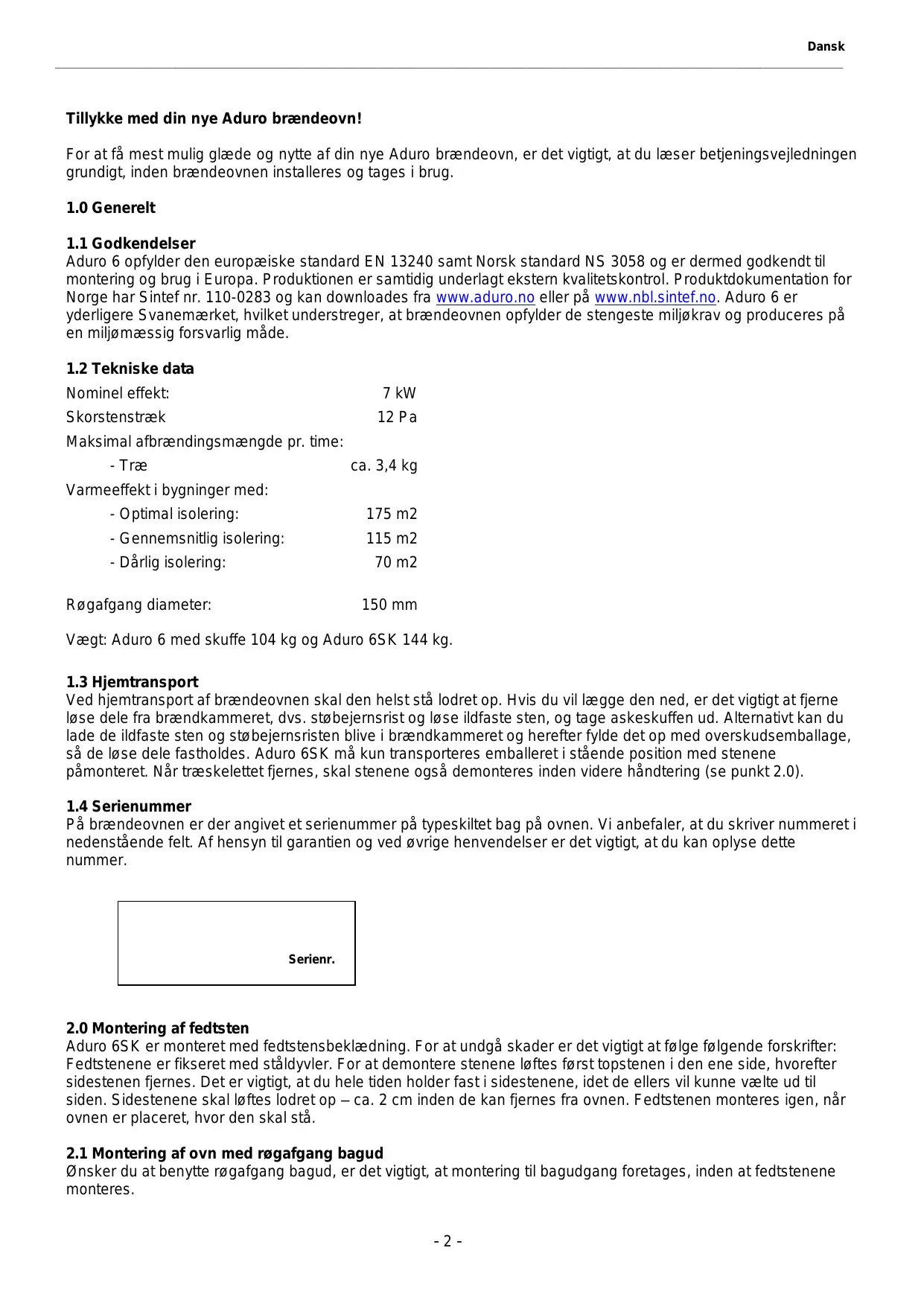 På brændeovnen er der angivet et serienummer på typeskiltet bag på ovnen. Vi anbefaler, at du skriver nummeret i nedenstående felt. Af hensyn til garantien og ved øvrige henvendelser er det vigtigt, at du kan oplyse dette nummer. Serienr.