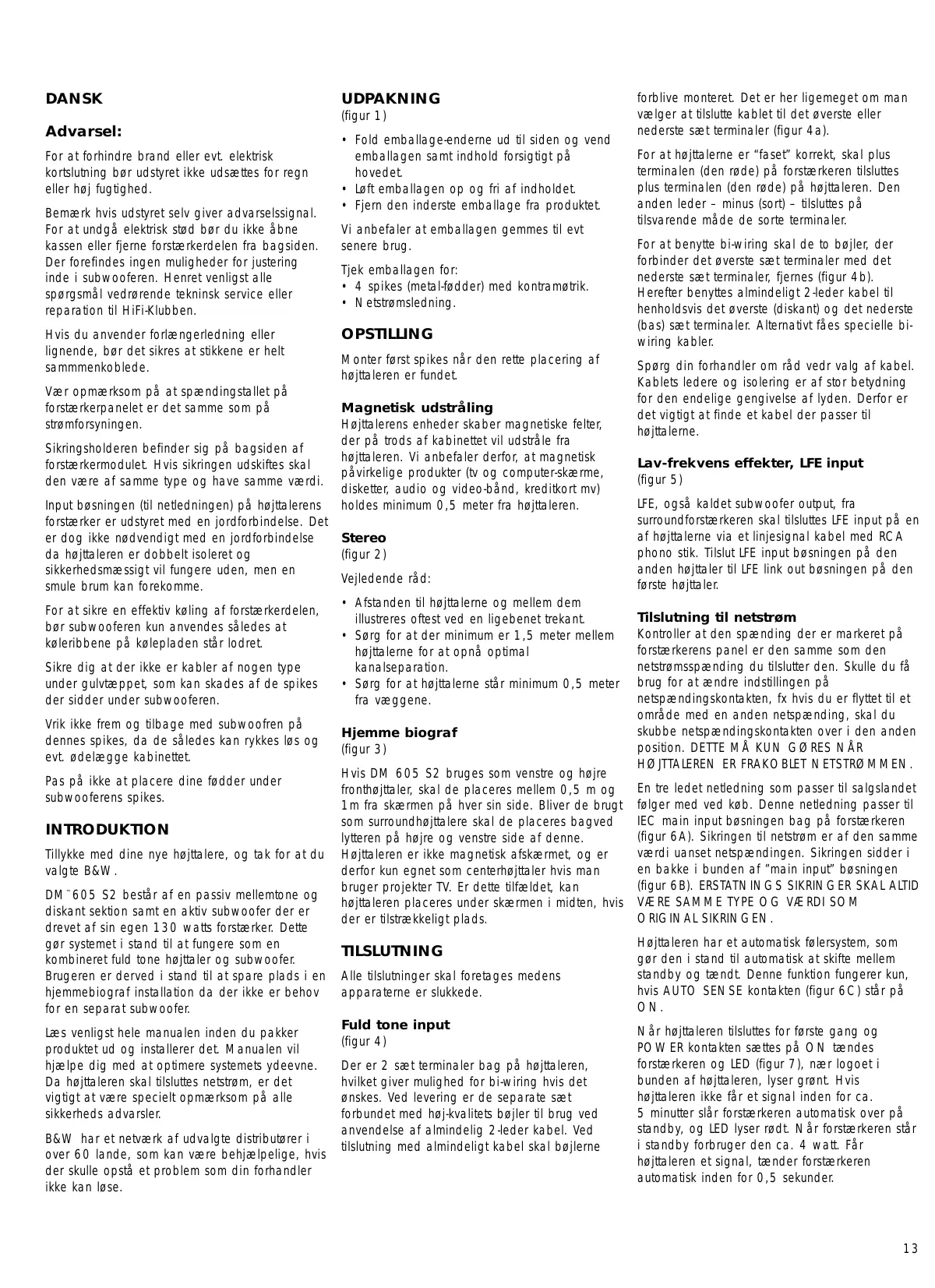 INTRODUKTION Tillykke med dine nye højttalere, og tak for at du valgte B&W. DM™605 S2 består af en passiv mellemtone og diskant sektion samt en aktiv subwoofer der er drevet af sin egen 130 watts forstærker. Dette gør systemet i stand til at fungere som en kombineret fuld tone højttaler og subwoofer. Brugeren er derved i stand til at spare plads i en hjemmebiograf installation da der ikke er behov for en separat subwoofer. Læs venligst hele manualen inden du pakker produktet ud og installerer det. Manualen vil hjælpe dig med at optimere systemets ydeevne. Da højttaleren skal tilsluttes netstrøm, er det vigtigt at være specielt opmærksom på alle sikkerheds advarsler. B&W har et netværk af udvalgte distributører i over 60 lande, som kan være behjælpelige, hvis der skulle opstå et problem som din forhandler ikke kan løse.