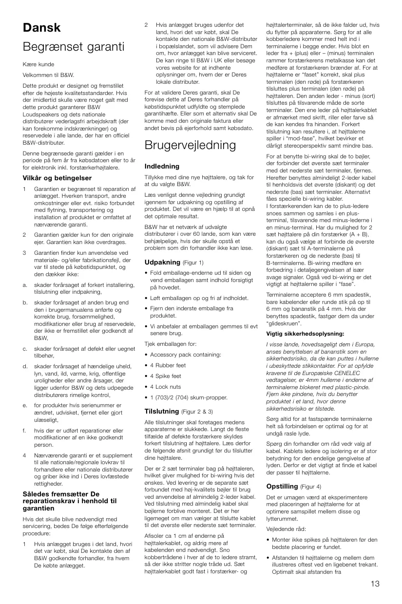 Brugervejledning Indledning Tillykke med dine nye højttalere, og tak for at du valgte B&W. Læs venligst denne vejledning grundigt igennem før udpakning og opstilling af produktet. Det vil være en hjælp til at opnå det optimale resultat. B&W har et netværk af udvalgte distributører i over 60 lande, som kan være behjælpelige, hvis der skulle opstå et problem som din forhandler ikke kan løse.