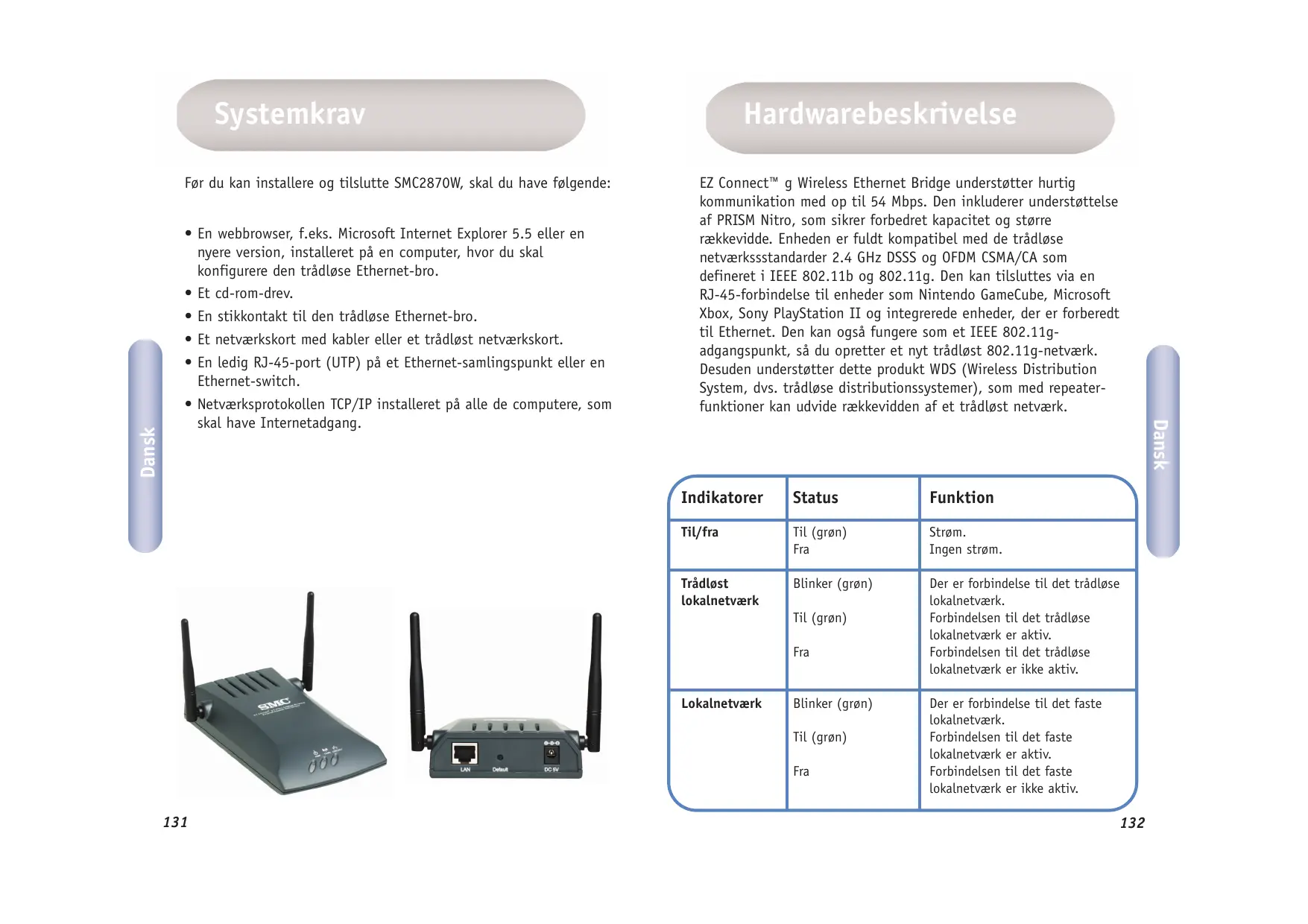 - Netværksprotokollen TCP/IP installeret på alle de computere, som skal have Internetadgang. EZ Connect™ g Wireless Ethernet Bridge understøtter hurtig kommunikation med op til 54 Mbps. Den inkluderer understøttelse af PRISM Nitro, som sikrer forbedret kapacitet og større rækkevidde. Enheden er fuldt kompatibel med de trådløse netværkssstandarder 2.4 GHz DSSS og OFDM CSMA/CA som defineret i IEEE 802.11b og 802.11g. Den kan tilsluttes via en RJ-45-forbindelse til enheder som Nintendo GameCube, Microsoft Xbox, Sony PlayStation II og integrerede enheder, der er forberedt til Ethernet. Den kan også fungere som et IEEE 802.11gadgangspunkt, så du opretter et nyt trådløst 802.11g-netværk. Desuden understøtter dette produkt WDS (Wireless Distribution System, dvs. trådløse distributionssystemer), som med repeaterfunktioner kan udvide rækkevidden af et trådløst netværk. Dansk Dansk Før du kan installere og tilslutte SMC2870W, skal du have følgende: Hardwarebeskrivelse Indikatorer Status Funktion Til/fra Til (grøn) Fra Strøm. Ingen strøm. Trådløst lokalnetværk Blinker (grøn) Der er forbindelse til det trådløse lokalnetværk. Forbindelsen til det trådløse lokalnetværk er aktiv. Forbindelsen til det trådløse lokalnetværk er ikke aktiv. Til (grøn) Fra Lokalnetværk Blinker (grøn) Til (grøn) Fra