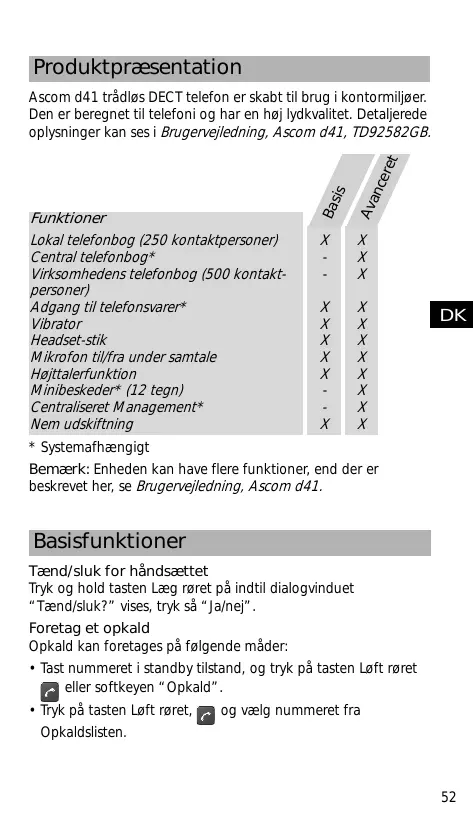 Lokal telefonbog (250 kontaktpersoner) Central telefonbog* Viksomhedens telefonbog (500 kontakt… - personer) Adgang til telefonsvarer* Vibrator Headset:stik Mikrofon tilfra under samtale Hojttalertanktion Minibeskeder* (12 tegn) Centraliseret Management* Nem udskiftning: + Systemafhængigt Bemærk: Enheden kan have flere funktioner, end der er beskrevet her, se Srugervejledhing, Ascom d41.