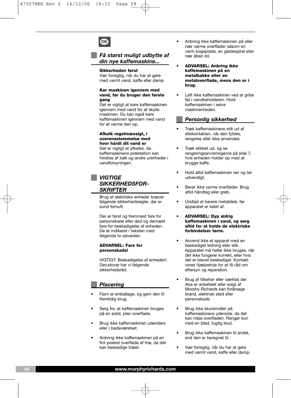 Alle produkter fra Morphy Richards testes individuelt, for de forlader fabrikken. Hvis det usandsynlige skulle ske, at der opstär fejl ved apparatet inden for 28 dage efter kobsdatoen, skal det returneres til den forretning, hvor det er kobt, og ombyttes med et andet.