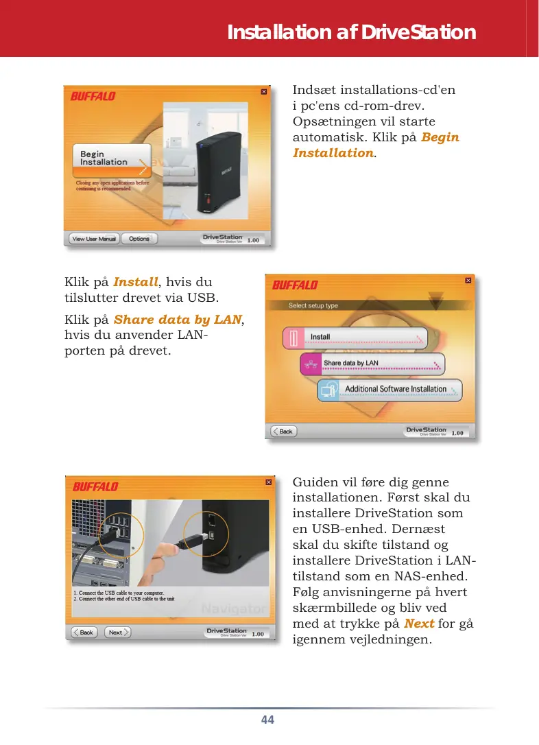 Guiden vil fore dig genne installationen. Forst skal du installere DriveStation som en USB-enhed. Dernæst skal du skifte tilstand og installere DriveStation i LAN-tilstand som en NAS-enhed. Følg anvisningerne på hvert skærmbillede og bliv ved med at trykke på Next for gå igennem vegledningen.
