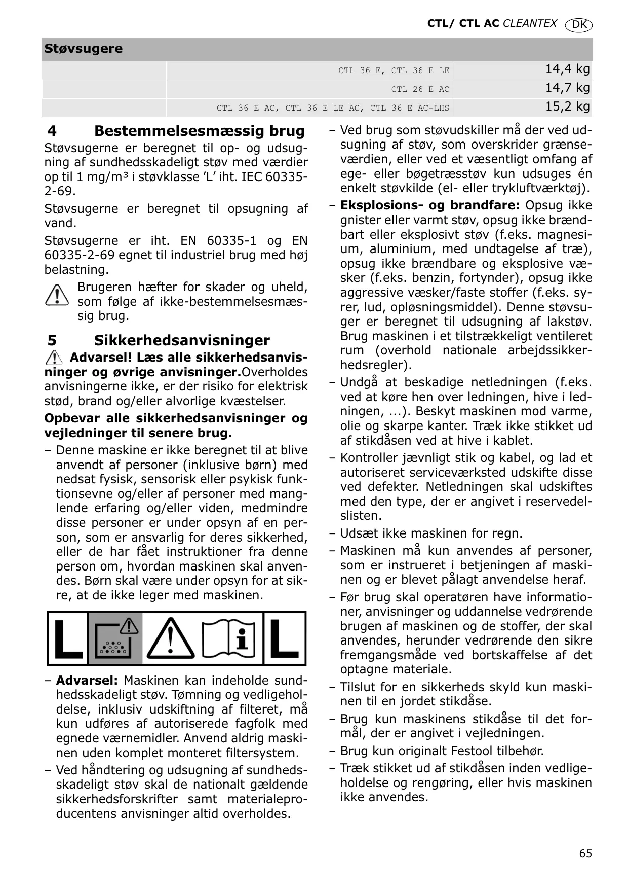 Sikkerhedsanvisninger Advarsel! Læs alle sikkerhedsanvisninger og øvrige anvisninger.Overholdes anvisningerne ikke, er der risiko for elektrisk stød, brand og/eller alvorlige kvæstelser. Opbevar alle sikkerhedsanvisninger og vejledninger til senere brug. – Denne maskine er ikke beregnet til at blive anvendt af personer (inklusive børn) med nedsat fysisk, sensorisk eller psykisk funktionsevne og/eller af personer med manglende erfaring og/eller viden, medmindre disse personer er under opsyn af en person, som er ansvarlig for deres sikkerhed, eller de har fået instruktioner fra denne person om, hvordan maskinen skal anvendes. Børn skal være under opsyn for at sikre, at de ikke leger med maskinen. – Advarsel: Maskinen kan indeholde sundhedsskadeligt støv. Tømning og vedligeholdelse, inklusiv udskiftning af filteret, må kun udføres af autoriserede fagfolk med egnede værnemidler. Anvend aldrig maskinen uden komplet monteret filtersystem. – Ved håndtering og udsugning af sundhedsskadeligt støv skal de nationalt gældende sikkerhedsforskrifter samt materialeproducentens anvisninger altid overholdes. – Ved brug som støvudskiller må der ved udsugning af støv, som overskrider grænseværdien, eller ved et væsentligt omfang af ege- eller bøgetræsstøv kun udsuges én enkelt støvkilde (el- eller trykluftværktøj). – Eksplosions- og brandfare: Opsug ikke gnister eller varmt støv, opsug ikke brændbart eller eksplosivt støv (f.eks. magnesium, aluminium, med undtagelse af træ), opsug ikke brændbare og eksplosive væsker (f.eks. benzin, fortynder), opsug ikke aggressive væsker/faste stoffer (f.eks. syrer, lud, opløsningsmiddel). Denne støvsuger er beregnet til udsugning af lakstøv. Brug maskinen i et tilstrækkeligt ventileret rum (overhold nationale arbejdssikkerhedsregler). – Undgå at beskadige netledningen (f.eks. ved at køre hen over ledningen, hive i ledningen, ...). Beskyt maskinen mod varme, olie og skarpe kanter. Træk ikke stikket ud af stikdåsen ved at hive i kablet. – Kontroller jævnligt stik og kabel, og lad et autoriseret serviceværksted udskifte disse ved defekter. Netledningen skal udskiftes med den type, der er angivet i reservedelslisten. – Udsæt ikke maskinen for regn. – Maskinen må kun anvendes af personer, som er instrueret i betjeningen af maskinen og er blevet pålagt anvendelse heraf. – Før brug skal operatøren have informationer, anvisninger og uddannelse vedrørende brugen af maskinen og de stoffer, der skal anvendes, herunder vedrørende den sikre fremgangsmåde ved bortskaffelse af det optagne materiale. – Tilslut for en sikkerheds skyld kun maskinen til en jordet stikdåse. – Brug kun maskinens stikdåse til det formål, der er angivet i vejledningen. – Brug kun originalt Festool tilbehør. – Træk stikket ud af stikdåsen inden vedligeholdelse og rengøring, eller hvis maskinen ikke anvendes.