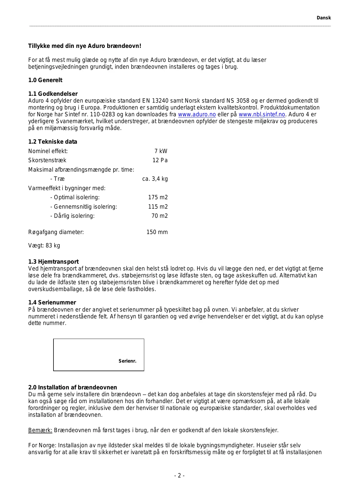 På brændeovnen er der angivet et serienummer på typeskiltet bag på ovnen. Vi anbefaler, at du skriver nummeret i nedenstående felt. Af hensyn til garantien og ved øvrige henvendelser er det vigtigt, at du kan oplyse dette nummer. Serienr.