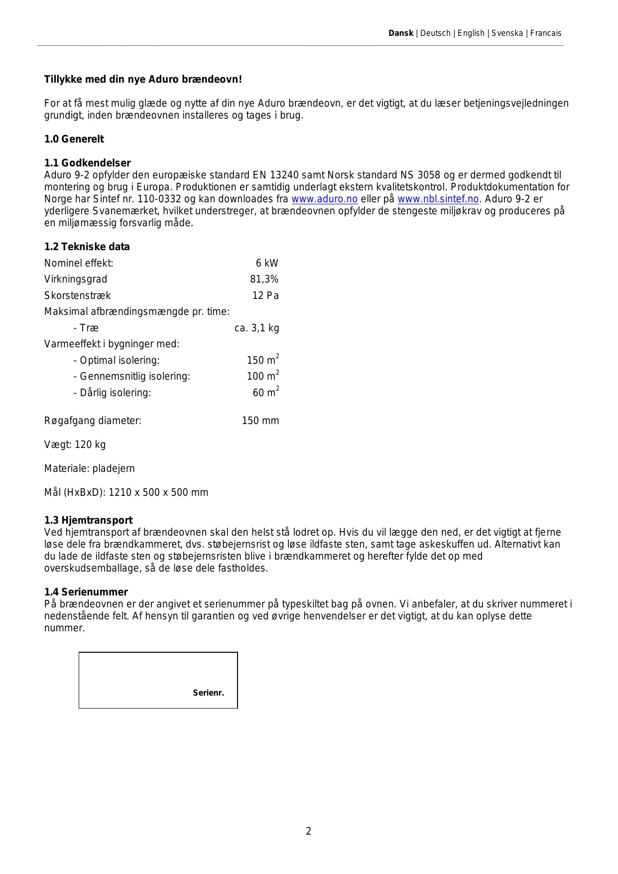 På brændeovnen er der angivet et serienummer på typeskiltet bag på ovnen. Vi anbefaler, at du skriver nummeret i nedenstående felt. Af hensyn til garantien og ved øvrige henvendelser er det vigtigt, at du kan oplyse dette nummer. Serienr.
