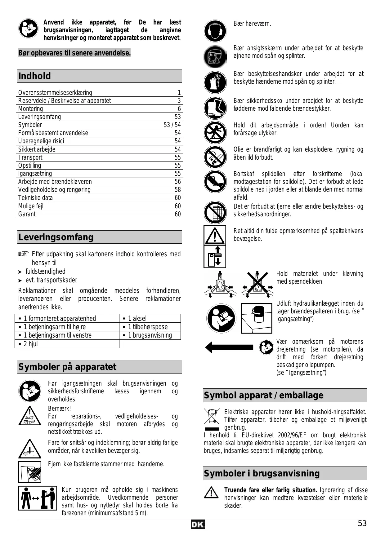 Anvend ikke apparatet, før De har læst brugsanvisningen, iagttaget angivne henvisninger og monteret apparatet som beskrevet. Bær høreværn. Bør opbevares til senere anvendelse. Bær ansigtsskærm under arbejdet for at beskytte øjnene mod spån og splinter. Indhold Bær beskyttelseshandsker under arbejdet for at beskytte hænderne mod spån og splinter. Overensstemmelseserklæring Reservdele / Beskrivelse af apparatet Montering Leveringsomfang Symboler Formålsbestemt anvendelse Uberegnelige risici Sikkert arbejde Transport Opstilling Igangsætning Arbejde med brændekløveren Vedligeholdelse og rengøring Tekniske data Mulige fejl Garanti