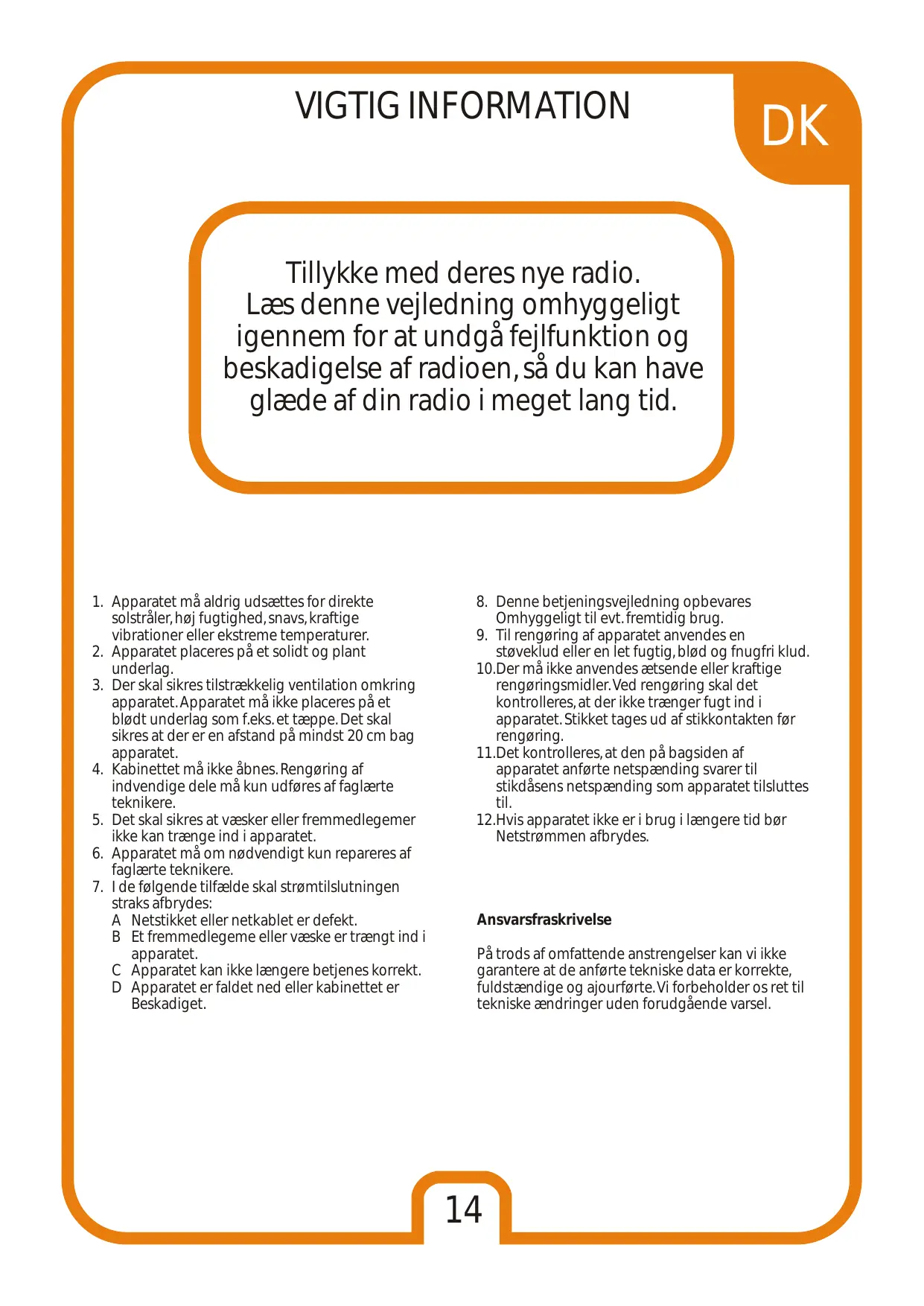 Tillykke med deres nye radio. Læs denne vejledning omhyggeligt igennem for at undgå fejlfunktion og beskadigelse af radioen, så du kan have glæde af din radio i meget lang tid.