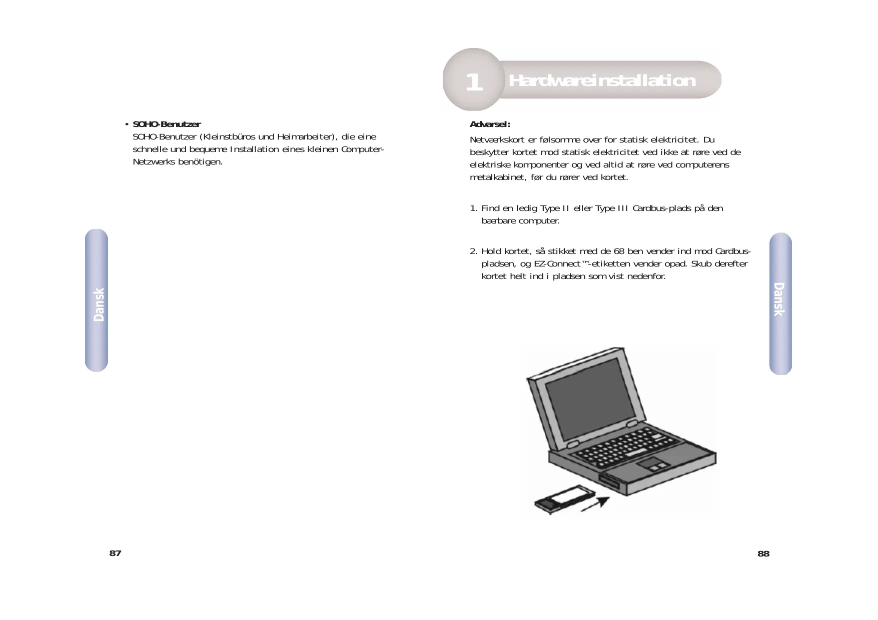 bærbare computer. 2. Hold kortet, så stikket med de 68 ben vender ind mod Cardbuspladsen, og EZ-Connect™-etiketten vender opad. Skub derefter kortet helt ind i pladsen som vist nedenfor. Dansk Dansk