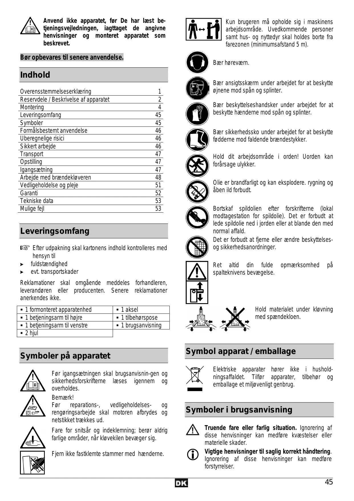 1 formonteret apparatenhed 1 betjeningsarm til højre 1 betjeningsarm til venstre 2 hjul Hold materialet under kløvning med spændekloen. 1 aksel 1 tilbehørspose 1 brugsanvisning Symbol apparat / emballage Symboler på apparatet Før igangsætningen skal brugsanvisnin-gen sikkerhedsforskrifterne læses igennem overholdes. Bemærk! Før reparations-, vedligeholdelsesrengøringsarbejde skal motoren afbrydes netstikket trækkes ud. Elektriske apparater hører ikke i husholdningsaffaldet. Tilfør apparater, tilbehør og emballage et miljøvenligt genbrug.